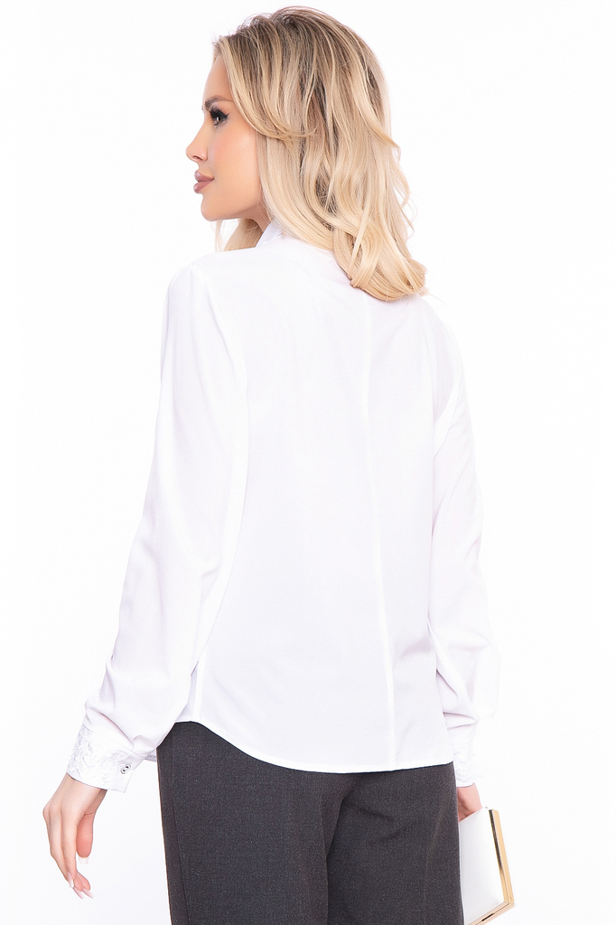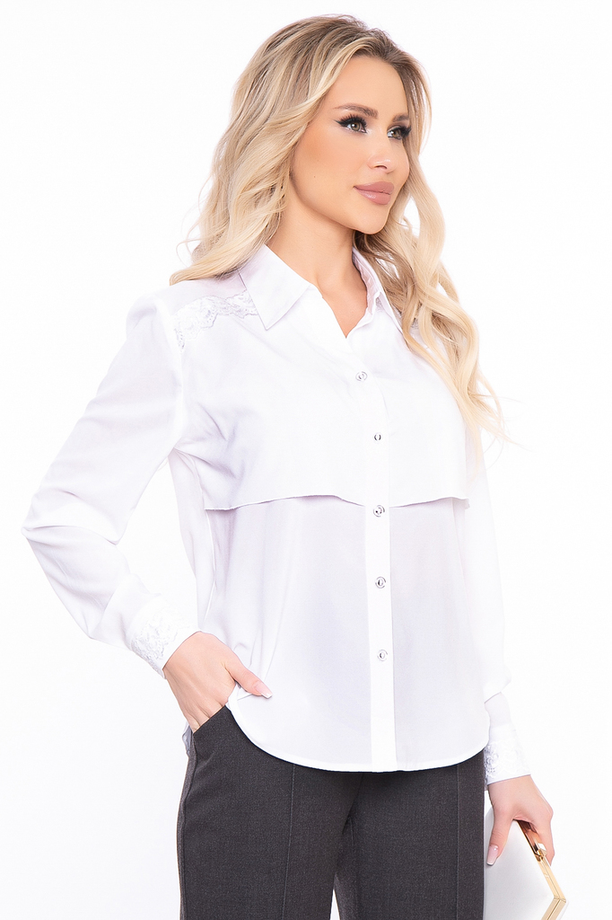 Нарядная блуза для создания классических и вечерних образов. Украшена кружевным шитьём, потому станет отличным вариантом на каждый день, а также не составит труда с её помощью создать и вечерний образ... Показать описание. Блуза приталенного силуэта выполнена из приятной к телу ткани; Рукав втачной, длинный, низ на манжете с пуговкой; Оригинальный крой манжета, который манжета, который притачивается в круговую; Мягкий V-образный вырез красиво подчеркивает зону декольте, рубашечный воротничок; Застегивается на пуговки по передней планке; Удлиненная спинка, скругленные края низа; Ткань: блузочная ткань; Состав: 95% п/э, 5% эластан; Цвет: белый; Декор: кружевное шитьё; Размерная линейка: 46-56; Длина готового изделия: 46 / 60 см, 48 / 63 см, 50 / 65 см, 52 / 67 см, 54 / 69 см, 56 / 70,5 см; Допуск отклонения длины при массовом производстве 1-3 см является нормой; Параметры представленные в размерной таблице относятся к объемам фигуры, если Вам необходимы конкретные замеры готового изделия обратитесь к менеджеру; Рекомендована ручная стирка при 30 С; Параметры модели: рост 168 см, грудь 87 см, талия 60 см, бедра 89 см;