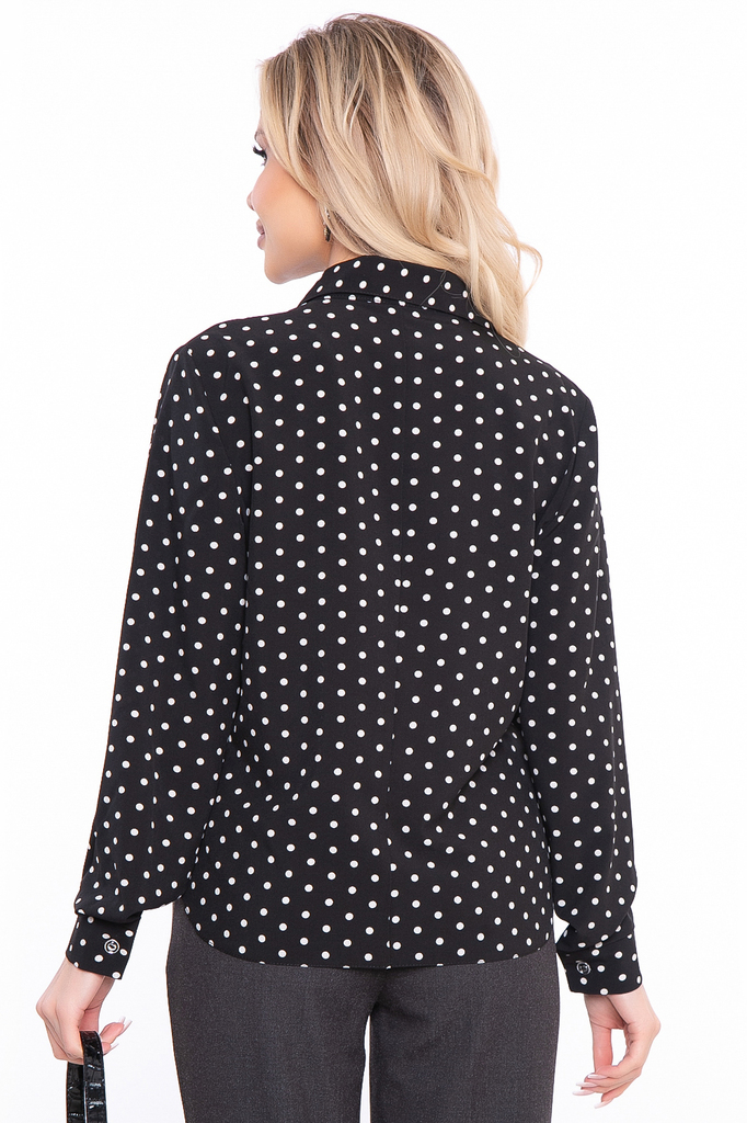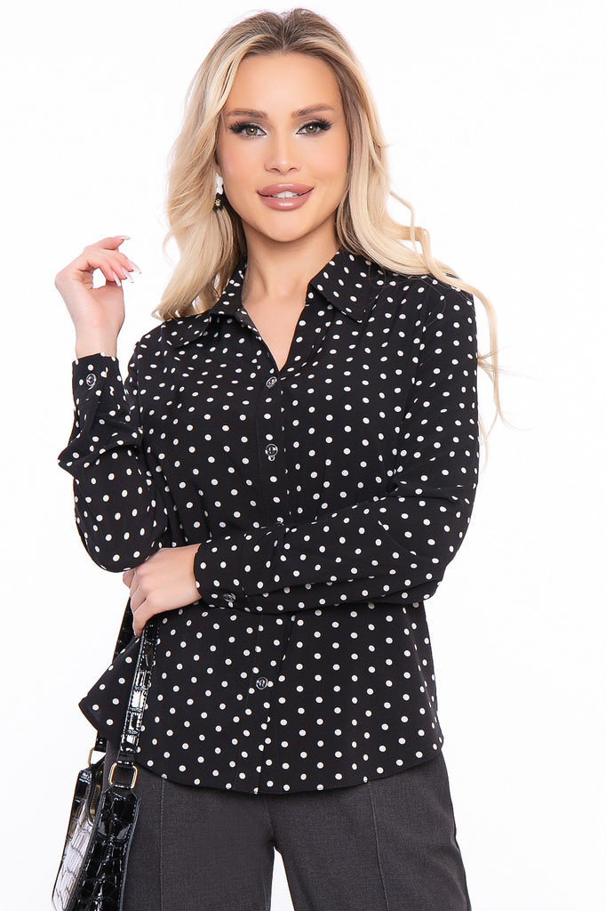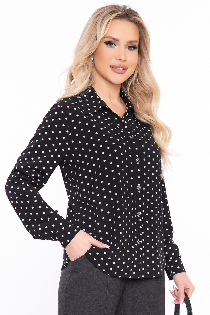 Шикарная блуза для создания классических и вечерних образов. Горошек – трендовый принт, который не теряет популярности уже несколько лет. Сеты с принтом в горох выглядят сильно и женственно, кроме тог... Показать описаниео, это рисунок «вне возраста», одежда в горошек хорошо смотрится и на молодых девушках, и на дамах постарше. Универсальная блуза приталенного силуэта выполнена из приятной к телу ткани; Рукав втачной, длинный, низ на манжете с пуговкой; Оригинальный крой манжета, который манжета, который притачивается в круговую; Мягкий V-образный вырез красиво подчеркивает зону декольте, рубашечный воротничок; Застегивается на пуговки по передней планке; Удлиненная спинка, скругленные края низа; Ткань: блузочная ткань; Состав: 95% п/э, 5% эластан; Цвет: чёрный; Принт: горох; Размерная линейка: 46-56; Длина готового изделия: 46 / 60 см, 48 / 63 см, 50 / 65 см, 52 / 67 см, 54 / 69 см, 56 / 70,5 см; Допуск отклонения длины при массовом производстве 1-3 см является нормой; Параметры представленные в размерной таблице относятся к объемам фигуры, если Вам необходимы конкретные замеры готового изделия обратитесь к менеджеру; Рекомендована ручная стирка при 30 С; Параметры модели: рост 168 см, грудь 87 см, талия 60 см, бедра 89 см;