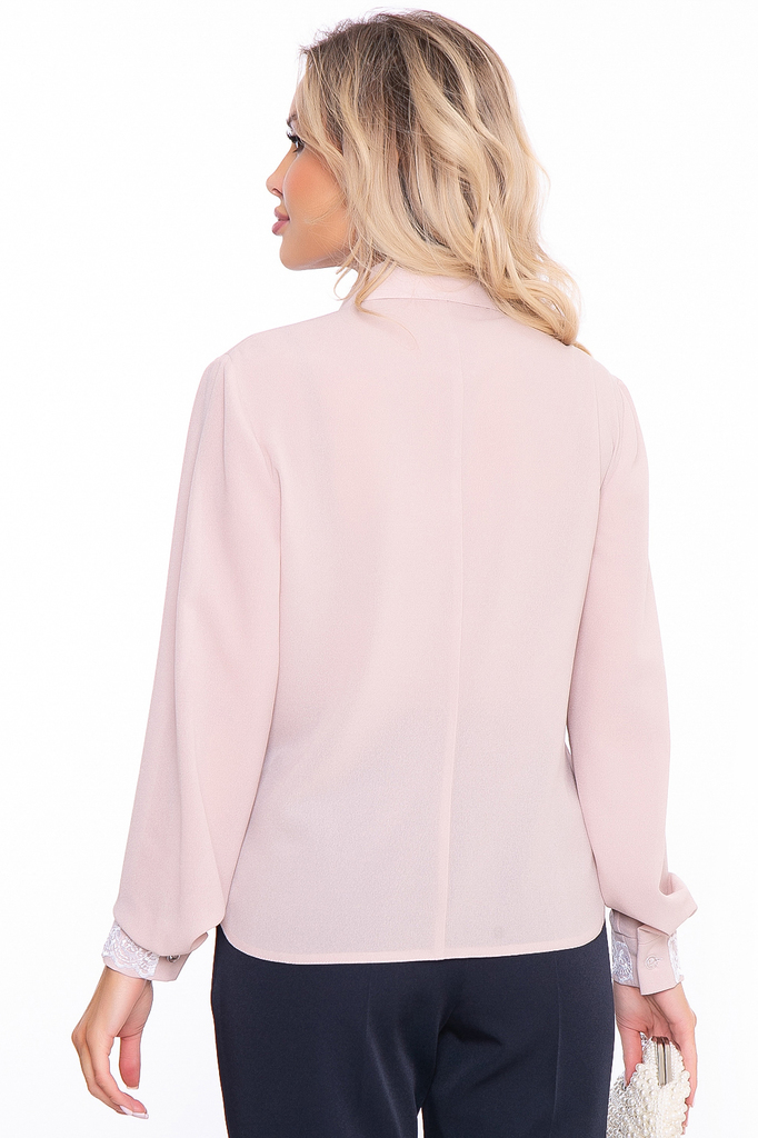Нарядная блуза для создания классических и вечерних образов. Украшена кружевным шитьём, потому станет отличным вариантом на каждый день, а также не составит труда с её помощью создать и вечерний образ... Показать описание. Блуза приталенного силуэта выполнена из приятной к телу ткани; Рукав втачной, длинный, низ на манжете с пуговкой; Оригинальный крой манжета, который манжета, который притачивается в круговую; Мягкий V-образный вырез красиво подчеркивает зону декольте, рубашечный воротничок; Застегивается на пуговки по передней планке; Удлиненная спинка, скругленные края низа; Ткань: блузочная ткань; Состав: 95% п/э, 5% эластан; Цвет: бежевый (пудра); Декор: кружевное шитьё; Размерная линейка: 46-56; Длина готового изделия: 46 / 60 см, 48 / 63 см, 50 / 65 см, 52 / 67 см, 54 / 69 см, 56 / 70,5 см; Допуск отклонения длины при массовом производстве 1-3 см является нормой; Параметры представленные в размерной таблице относятся к объемам фигуры, если Вам необходимы конкретные замеры готового изделия обратитесь к менеджеру; Рекомендована ручная стирка при 30 С; Параметры модели: рост 168 см, грудь 87 см, талия 60 см, бедра 89 см;