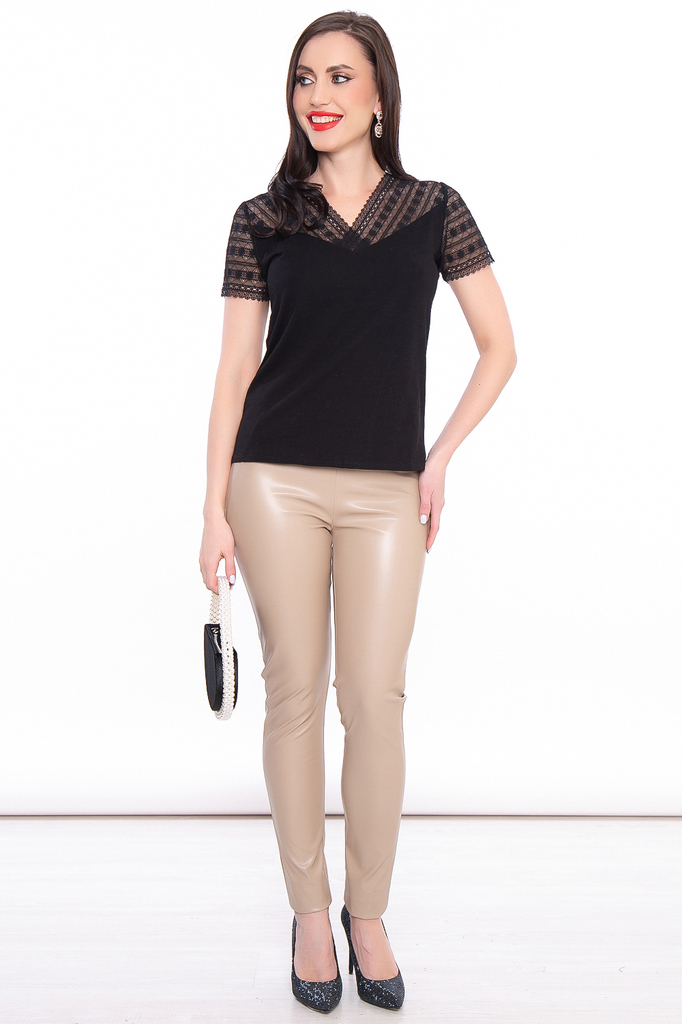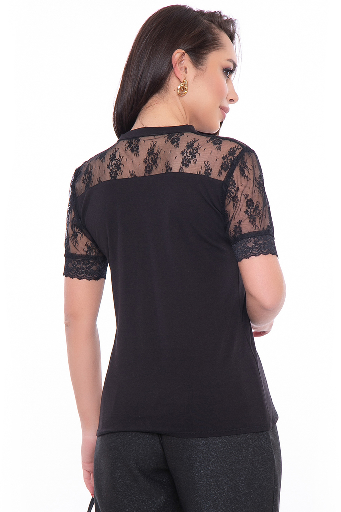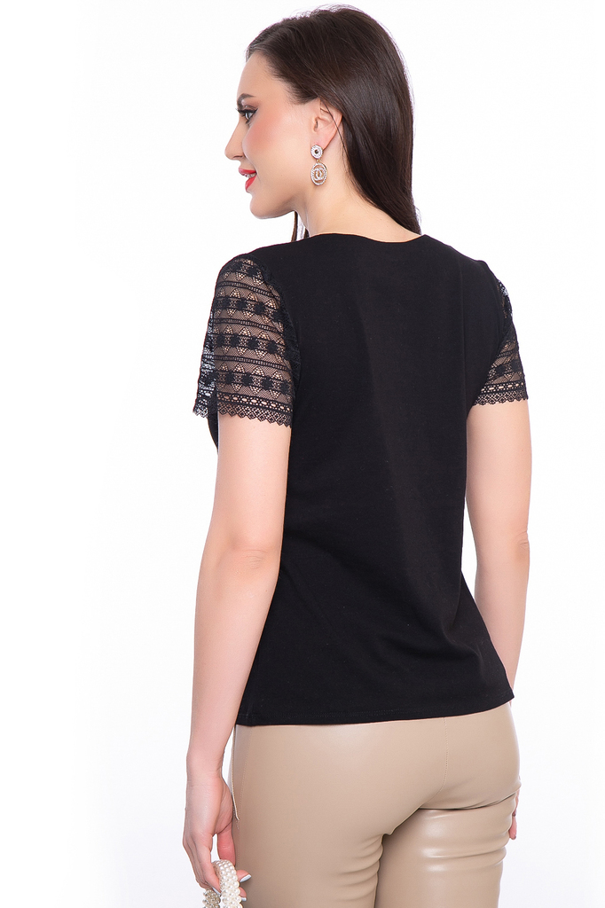 Стильная и удобная трикотажная блуза прекрасно будет комбинироваться с любым низом, будь то джинсы, брюки, лосины или юбка. Её можно надеть под жакет или кардиган и с лёгкостью создать загадочны... Показать описанией женственный образ. Базовая блуза прилегающего силуэта со вставками из эластичного гипюра; Округлый вырез горловины, рукав короткий, втачной, выполнен из гипюра в тон, на манжете из гипюровой ленты; Блуза без замков и застежек; Состав: 95% хлопок, 5% спандекс; Ткань: трикотаж (хорошо растяжим); Цвет: чёрный; Размерная линейка: 46-56; Длина готового изделия по спинке: 46-56 / 63 см; Допуск отклонения длины при массовом производстве 1-3 см является нормой; Рекомендована ручная стирка при 30 С; Параметры модели: рост 167 см, грудь 88 см, талия 65 см, бедра 92 см.