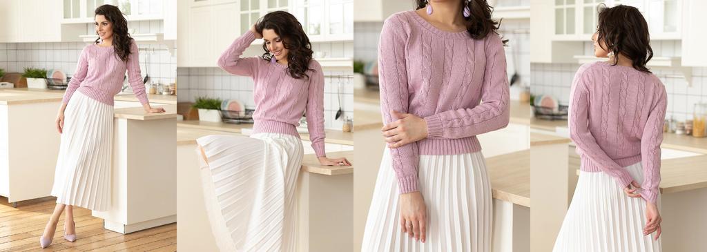 Трикотажные джемпер полуприлегающего силуэта длиной до линии бедра с фактурной вязкой по переду. Рукав втачной прямого покроя стандартной длины. Вырез горловины круглый. Размеры выбираются в соответст... Показать описаниевии с обхватом по груди согласно ГОСТ 17522-72 о типовых фигурах женщин. 42й размер соответствует Ог=84 см. Стандартный обхват бёдер при этом 92см. 44й размер соответствует Ог=88 см. Стандартный обхват бёдер при этом 96см. 46й размер соответствует Ог=92 см. Стандартный обхват бёдер при этом 100см. 48й размер соответствует Ог=96 см. Стандартный обхват бёдер при этом 104см. 50й размер соответствует Ог=100 см. Стандартный обхват бёдер при этом 108см. 52й размер соответствует Ог=104 см. Стандартный обхват бёдер при этом 112см. 54й размер соответствует Ог=108см. Стандартный обхват бёдер при этом 116см. Фабрика производит изделия на рост 170 см. Большинство изделий при стандартных обхватах подойдут на роста 165-175 см.