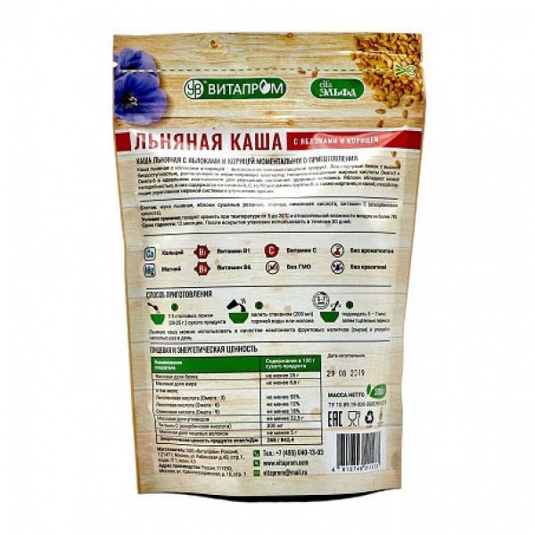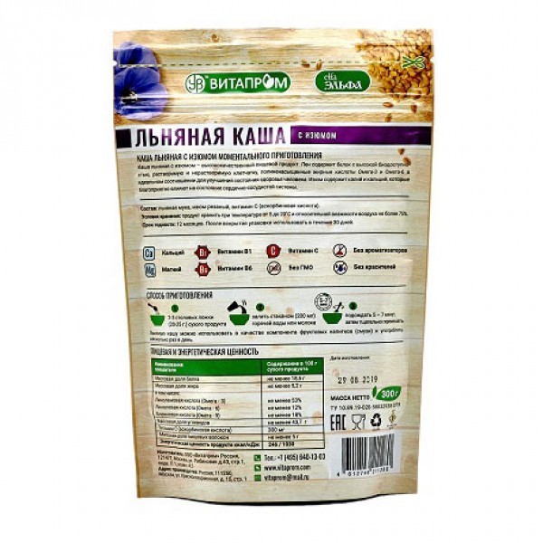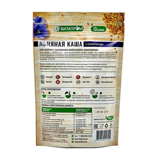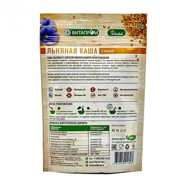 Льняная каша с натуральными компонентами – это вкусный диетический продукт, необходимый для правильного и сбалансированного питания человека. Состав полезных веществ льняной каши поистине уникален, ве... Показать описаниедь в нем сохраняются все важные составляющие льняных семян: полиненасыщенные жирные кислоты (ПНЖК), витамины, минералы, белки, лигнаны, и пищевые волокна. Льняная каша «Эльфа» – это богатый природный источник витаминов А, Е, В1, ВЗ, В6, В12, ферментов и таких необходимых микро- и макронутриентов как калий, кальций, магний, фосфор, железо, медь, цинк, марганец, бор, хром, натрий. Семена белого льна являются лучшими естественными источниками селена, а калия в них содержится в семь раз больше, чем в бананах. Натуральные компоненты, добавленные в Льняную кашу ООО «ВИТАПРОМ», являются дополнительными источниками клетчатки, антиоксидантов, витаминов и микроэлементов улучшая, таким образом, общее состояние здоровья человека! Новая линейка продукции компании ВИТАПРОМ - идеальное и вкусное блюдо, как для полноценного обеда, так и для легкого перекуса! Аминокислотный состав белков льняного семени близок к аминокислотному составу соевых белков и обладает высокой биодоступностью. Льняной белок является одним из наиболее питательных протеинов растительного происхождения. Массовая доля жира в составе каш колеблется от 12 до 20%. В основном она представлена полиненасыщенными жирными кислотами семейства омега-3 и омега-6, и практически не содержит нежелательные в пищевом рационе насыщенные жирные кислоты. Льняную кашу «Эльфа» можно употреблять в качестве основного блюда с молоком, йогуртом, фруктовым соком, медом, а также в виде добавки к супам, домашней выпечке и соусам. Способ приготовления: 2-3 столовых ложки (20-25 г.) сухого продукта залить стаканом (200 мл) горячей воды или молока, подождать 5 – 7 минут, затем тщательно перемешать. Льняную кашу можно использовать в качестве компонента фруктовых напитков (смузи) и употреблять несколько раз в день. Условия хранения: продукт хранить при температуре от 0 до 25˚С и относительной влажности воздуха не более 85%.