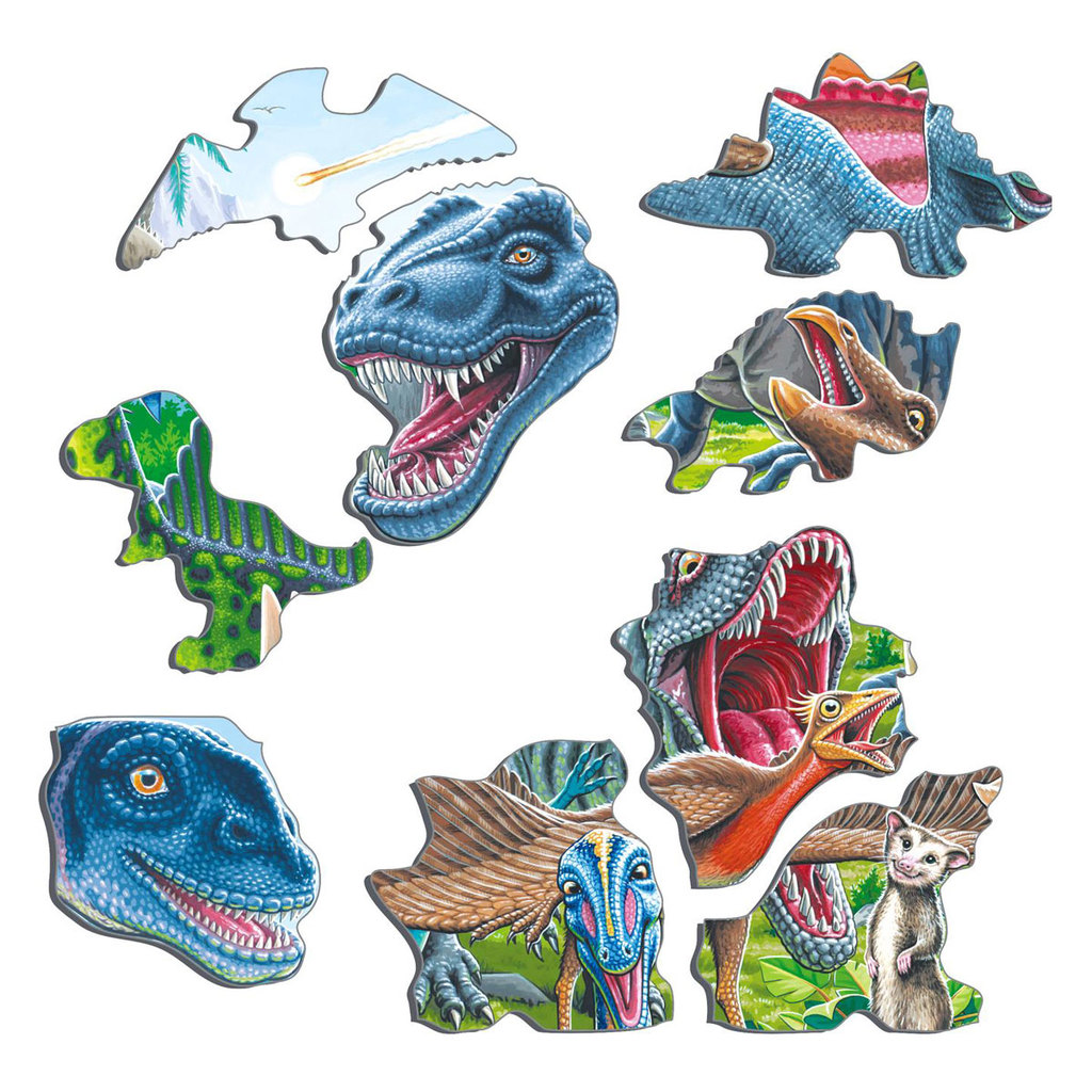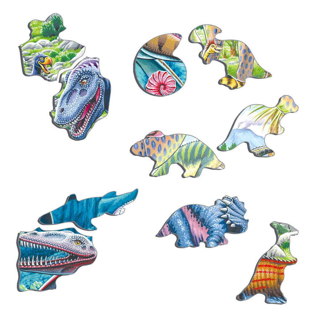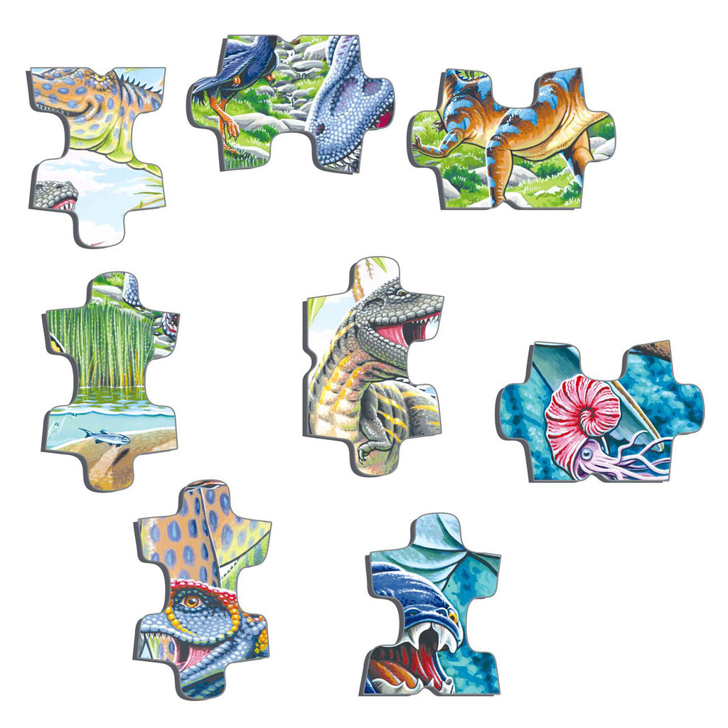 В эпоху динозавров на земле было много мелководных морей и стоял теплый климат. В пазле «Летающие, прыгающие и ныряющие динозавры» розовый птеранодон летит высоко над смертоносным гиганотозавром. Гига... Показать описаниенотозавр был даже крупнее тираннозавра Рекса, у которого на картинке обе ноги в воде. Барионикс поймал рыбу, которую он держит своей длинной мордой, по форме напоминающей морду крокодила, идеально подходящую для ловли рыбы. Дакозавр, который плавает в левом нижнем углу, является дальним родственником современных крокодилов. Сине-жёлтая рыба в нижней части пазла — данклеостеус. Его длина, вероятно, составляла более 8 метров. Детали пазла вырезаны по контурам изображения, а некоторые из них имеют форму динозавров. В комплекте: 70 деталей пазла Подложка Размер поля: 36,5 х 28,5 см.