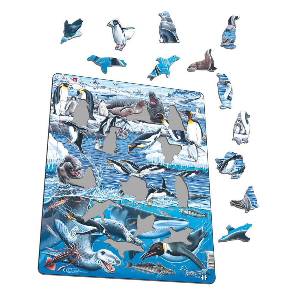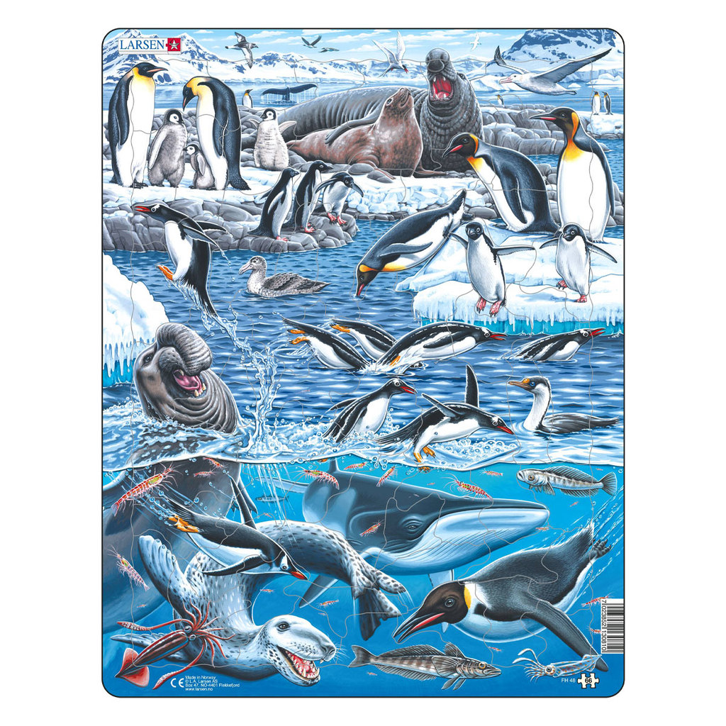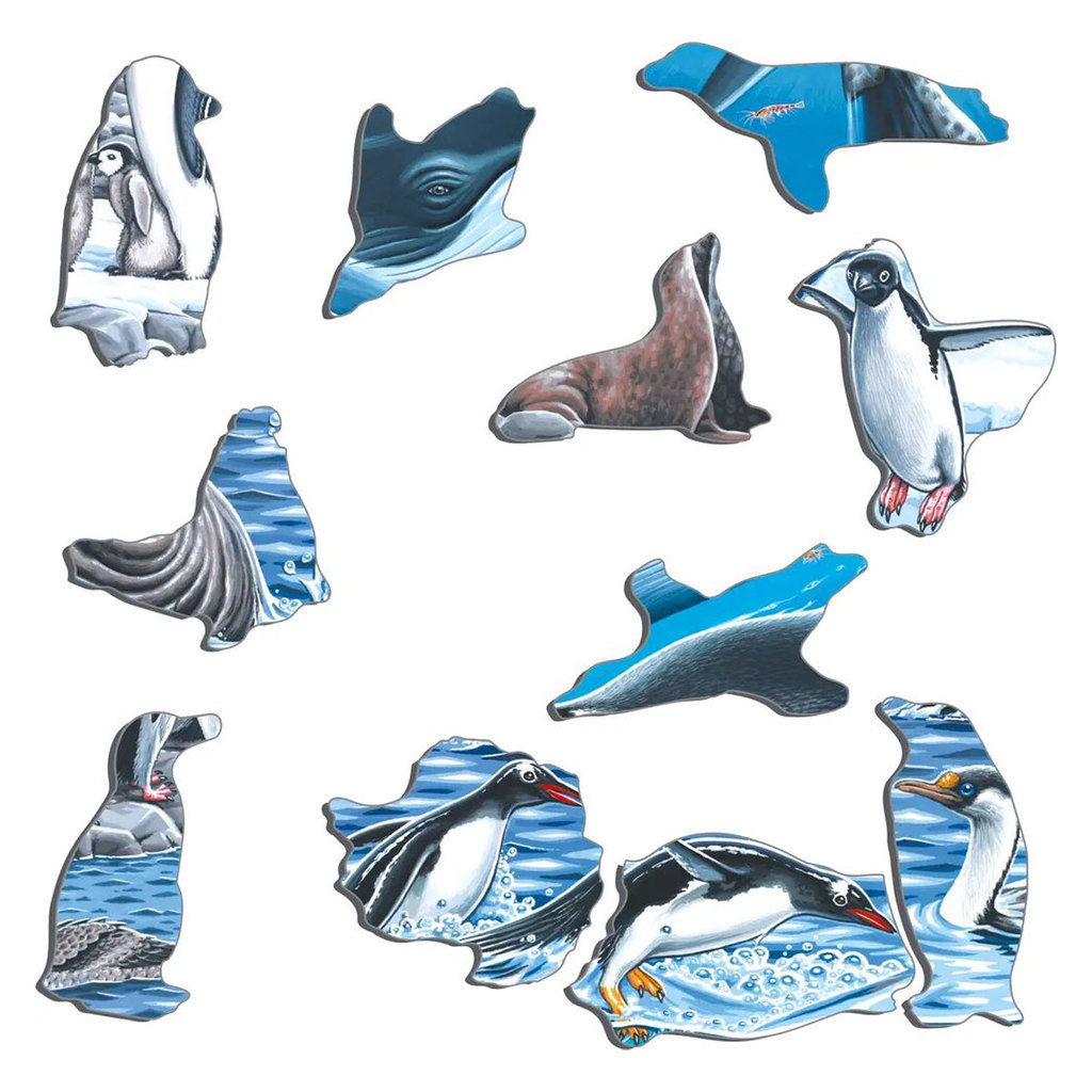 Антарктида — самый холодный континент на Земле. Море вокруг Антарктиды богато питательными веществами, и здесь в очень большом количестве обитает мелкий криль. Антарктический криль — крупнейший источн... Показать описаниеик животного белка, который является кормом для разнообразных обитателей этого материка: гигантских китов, рыб, тюленей и морских птиц. На пазле изображены такие животные, как: антарктический буревестник, антарктический синеглазый баклан, полярная крачка, снежный буревестник, южный странствующий альбатрос, императорский пингвин, пингвин Адели, королевский пингвин, папуанский пингвин, антарктический гигантский буревестник, горбатый кит, морской слон, южный малый полосатик, морской леопард, антарктический летающий кальмар, антарктический кальмар, ледяная рыба, антарктический криль. Некоторые из деталей пазла имеют форму тюленей и пингвинов. В набор входит 66 деталей пазла. Размер собранного поля — 36,5 х 28,5 см.