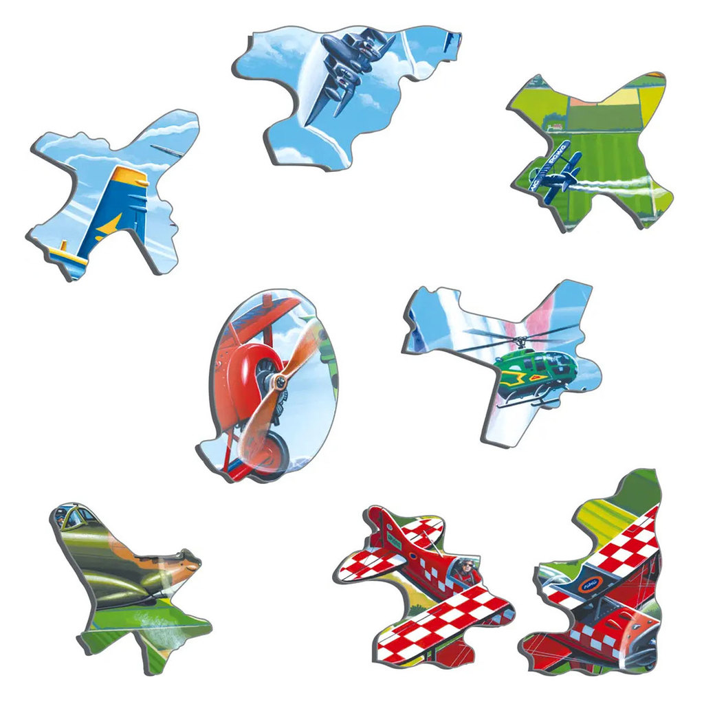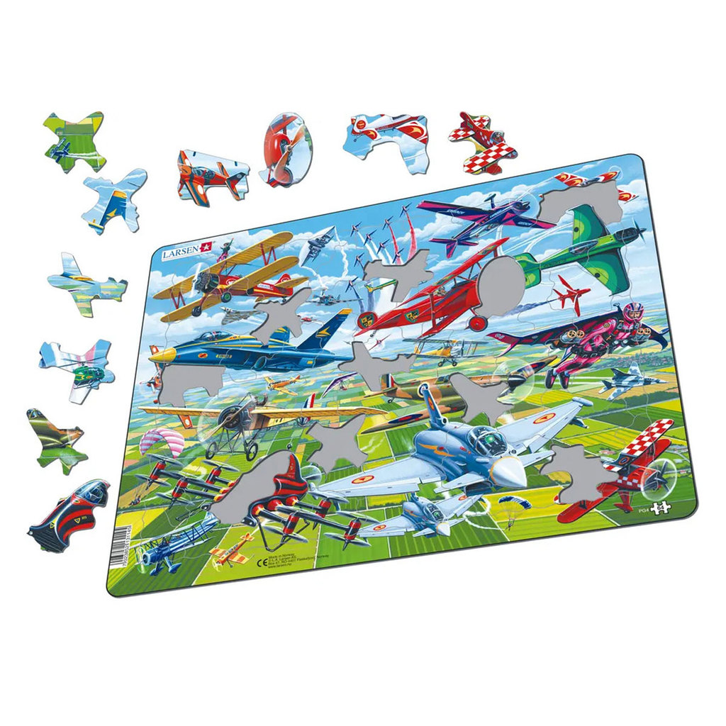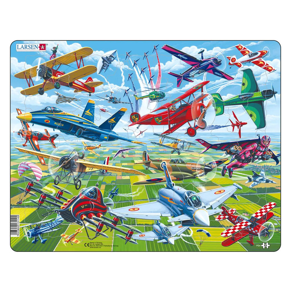 Ларсен представляет сюжет пазла с разнообразными моделями самолётов в зрелищном авиашоу. Здесь есть бипланы и триплан, параплан и вертолёт. Здесь даже есть мультикоптер и реактивный ранец с крыльями, ... Показать описаниекак демонстрация технических инноваций, которые, возможно, появятся в будущем. Многие детали пазла вырезаны по контурам изображения, а некоторые имеют форму самолётов. В набор входит 64 элемента пазла. Размер собранного поля — 36,5 х 28,5 см.