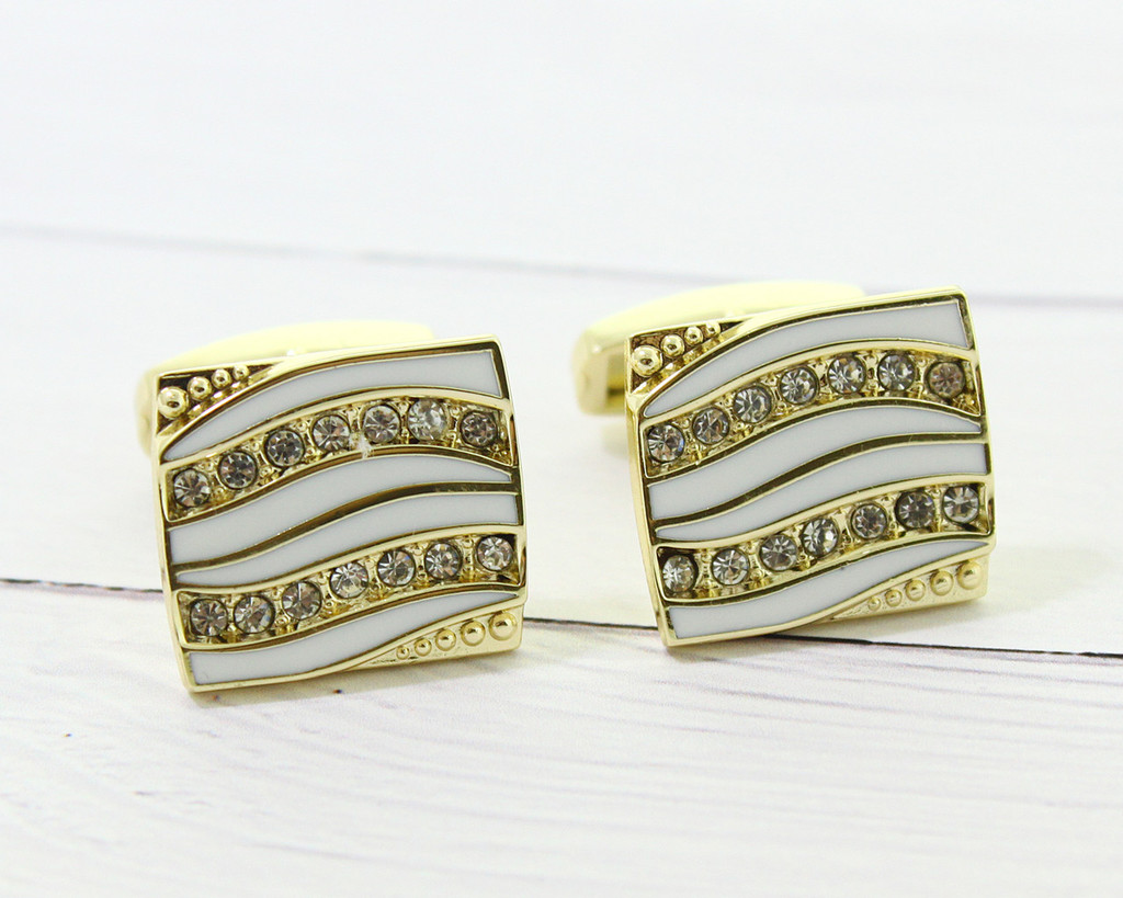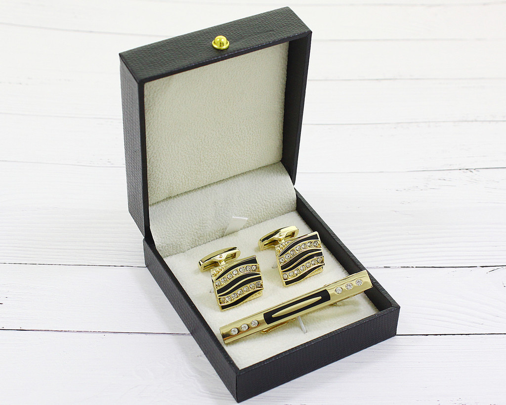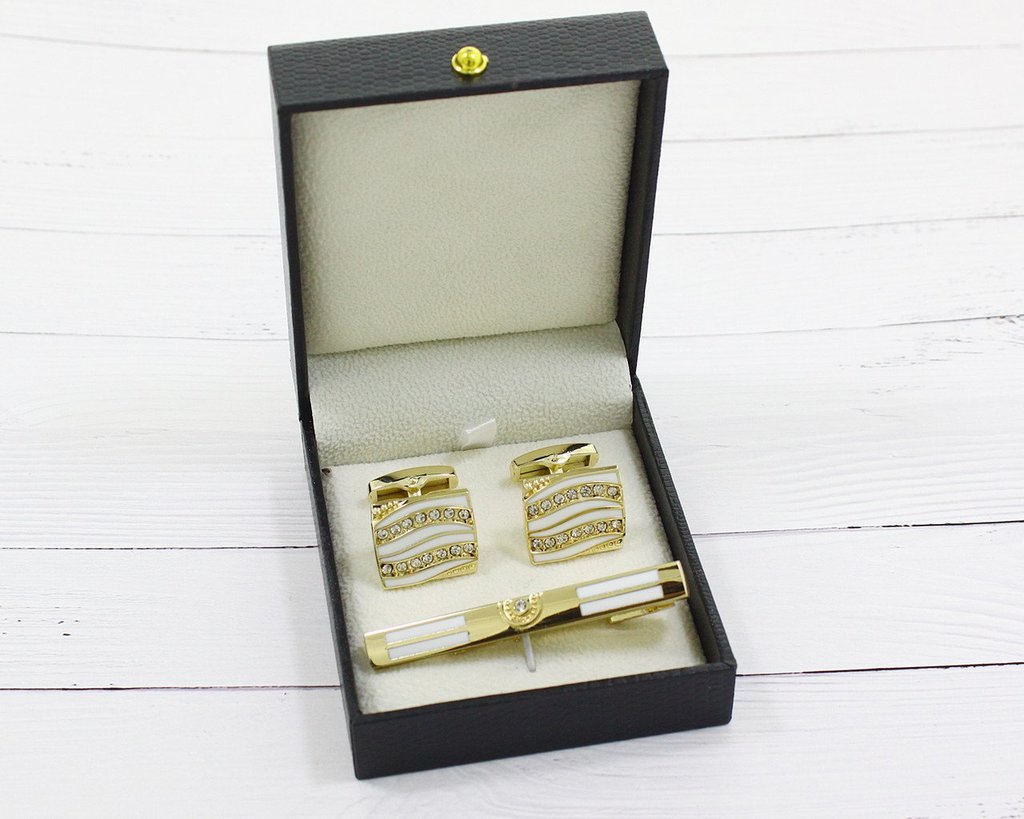 Механизм сцепки запонок: вращающийся штырек; камни вставки: стразы; материал: гипоаллергенный ювелирный сплав/ эмаль; цвет металла: золотистый набор зажим для галстука и запонки для элегантного мужчин... Показать описаниеы..