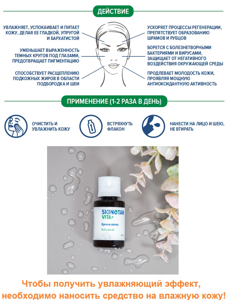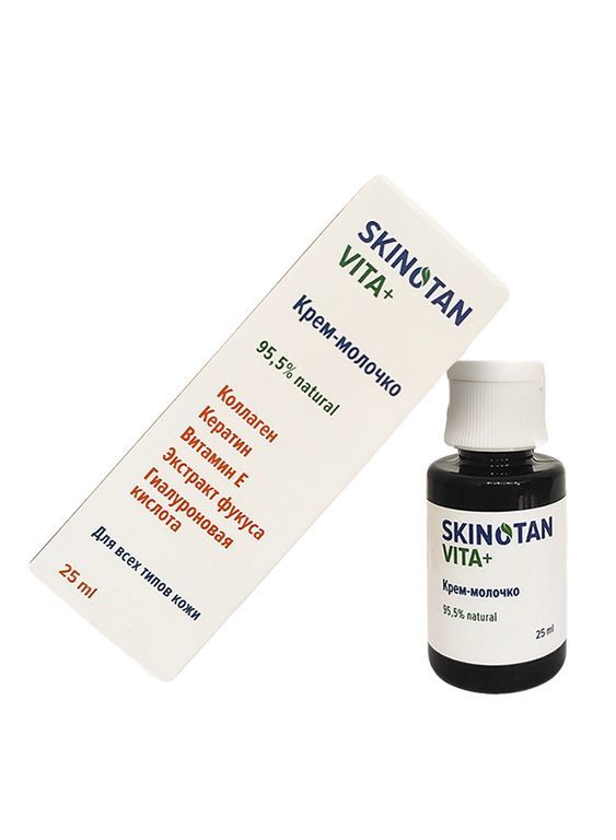 Благодаря инновационному, научно разработанному составу, крем-молочко «SKINOTAN VITA+» оказывает ярко выраженное комплексное действие на кожу лица и шеи. Обладая легкой текстурой, средство быстро впит... Показать описаниеывается, не оставляя жирного блеска. Уже через 2-3 минуты после его нанесения кожа, получив необходимую порцию влаги и витаминов, заметно преображается, радуя вас своей молодостью и свежестью! Действие: Увлажняет и питает кожу, делая ее гладкой, упругой и бархатистой. Ускоряет процессы восстановления (регенерации) после любых воздействий на кожу. Снимает воспаления, успокаивает кожу, выравнивает цвет лица и шеи. Препятствует образованию шрамов и рубцов. Способствует расщеплению подкожных жиров в области подбородка и шеи. Защищает от негативного воздействия окружающей среды. Борется с болезнетворными бактериями и вирусами. Стимулирует синтез коллагена, предотвращает пигментацию. Уменьшает выраженность темных кругов под глазами. Продлевает молодость кожи, проявляя мощную антиоксидантную активность. Состав: вода подготовленная, оливковое масло нерафинированное первого холодного отжима, экстракт фукуса пузырчатого, стеариновая кислота, эмульсионный воск, высокоочищенные белки коллаген и кератин в биодоступной форме, низко- и высокомолекулярная гиалуроновая кислота, масло мускатного шалфея, витамин Е, хинозол. Оливковое масло – это природный источник красоты и молодости. Полезные вещества, содержащиеся в нем, оказывают комплексное ухаживающее и защитное действие. Экстракт фукуса пузырчатого оказывает мощное антивозрастное действие, способствует расщеплению подкожных жиров в области подбородка и шеи. Гидролизованный коллаген благодаря малым размерам проникает в глубокие слои эпидермиса и становится строительным материалом для новых волокон, удерживающих кожу в подтянутом состоянии. Кератин встраивается в дефекты тканей, восстанавливает их рельеф и способствует ускорению регенерации кожи. Низкомолекулярная и высокомолекулярная гиалуроновая кислота продолжительное время удерживают молекулы воды и поддерживает гидробаланс кожи. Масло мускатного шалфея стимулирует обновление клеток. Витамин Е (токоферол) – мощный антиоксидант, блокирующий действие свободных радикалов. Хинозол обладает выраженными антисептическими свойствами. Содержание в креме-молочке не превышает 0,001%. Крем-молочко «SKINOTAN VITA+» не имеет в составе парабенов, красителей и синтетических отдушек. Подходит для всех типов кожи. Применение: Наносить тонким слоем 1-2 раза в день на влажную, предварительно очищенную кожу лица и шеи. Не втирать! Время впитывания: 2-3 минуты. Возможно нанесение на зону вокруг глаз. ПЕРЕД ПРИМЕНЕНИЕМ ВСТРЯХНУТЬ! Важно! Эффективность средства значительно повышается, если наносить его на еще влажную кожу через 1 минуту после применения сыворотки-тоника «SKINOTAN VITA+». При отрицательных температурах нежелательно длительное нахождение на открытом воздухе раньше, чем через 40 минут после нанесения сыворотки. Противопоказания: индивидуальная непереносимость компонентов, входящих в состав средства. Срок хранения: 9 месяцев при температуре 4 – 6˚С 6 месяцев при температуре 20 – 25˚С