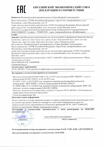 Уникальный крем, который защищает кожу от обветривания в холодные зимние дни и успокаивает после активного воздействия солнца. Оливковое масло обладает смягчающими и увлажняющими свойствами, разглажив... Показать описаниеает кожу и снимает раздражение. Способствует быстрому заживлению повреждений. Особенно полезно для чувствительной кожи. Молочная кислота стимулирует замедляющийся с возрастом процесс обновления клеток эпидермиса. Делает кожу максимально эластичной, хорошо увлажняет ее. Натуральный гель алое-вера, получаемый из свежего сока листьев Aloe barbadensis, богат аминокислотами, витаминами и полисахаридами. Превосходно увлажняет и успокаивает кожу. Нормализует цвет лица, разглаживая кожу и устраняя отёчность. Молочная кислота, гель алое-вера и экстракт гамамелиса благотворно воздействуют на жировой обмен кожи, оказывают антибактериальное воздействие и способствуют сужению пор. Эта композиция успешно используется как в антивозрастных кремах, так и в средствах для проблемной кожи. Эмульгатор полавакс - получают из растительных масел. Он хорошо смягчает кожу и предотвращает испарение влаги. Прополис это универсальное бактерицидное средство! Ни один из других продуктов пчеловодства не может соперничать с ним в способности сдерживать рост микроорганизмов. Он обладает анестезирующим эффектом. Принесет облегчение после солнечного ожога или обморожения. Аллантоин. Всемирная Организация Здравоохранения включила это вещество в список местных анастетиков и противовоспалительных препаратов! Незаменим для сухой, обветренной или обожженной кожи в условиях агрессивной внешней среды (ветер, солнце, мороз, значительные перепады температур и влажности, в условиях высокогорья. ) ОЗНАКОМИТЬСЯ СО СПОСОБОМ ПРИМЕНЕНИЯ И ОТЗЫВАМИ МОЖНО ПО ЭТОЙ ССЫЛКЕ