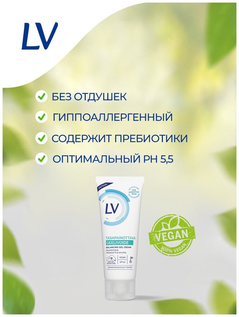 Балансирующий крем-гель для лица LV для жирной и комбинированной кожи лица разработан совместно с «Союзом против аллергии и астмы Финляндии» для обладателей чувствительной кожи. Этот финский продукт о... Показать описаниебъединяет в себе два продукта: увлажняющий матирующий дневной крем и базу под макияж. Идеально подойдет людям, склонным к аллергии, а также: 1. Тем, кто ищет крем для лица без отдушки и запаха; 2. Обладателям жирной чувствительной и проблемной кожи, которые ищут матирующий крем с лёгкой текстурой и некомедогенным составом; 3. Любителям эко-продуктов, которые следят за здоровьем. Крем для кожи лица увлажняет, матирует и выравнивает жирную и комбинированную кожу. Содержит пребиотики растительного происхождения, которые помогают восстановить и поддержать здоровый микробиом кожи. Безопасен для здоровья, не вызывает аллергии. Быстро впитывается за счет легкой текстуры без ощущения ""липкости"". Подходит для дневного и ночного ухода. Крем имеет веганский состав и оптимальный уровень pH 5,5.