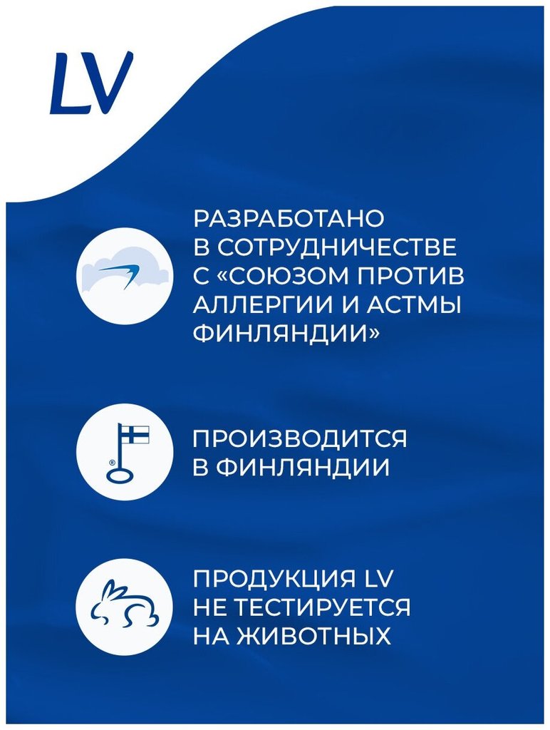 Гипоаллергенная косметика и бытовая химия LV великолепно подходит для людей, страдающих от астмы, так как эти средства разработаны совместно с «Союзом против аллергии и астмы Финляндии» и полностью гипоаллергенны, не содержат раздражителей для человека, о чем свидетельствует: - «Значок с Ласточкой» на каждой упаковке продукции LV. - «Значок с Журавликом» - отметка финских специалистов-биологов о том, что продукция LV полностью экологически чистая, не содержит отдушек, подкрашивающих ткани веществ, также в составе бытовой химии и косметики LV отсутствуют хлор, цеолиты, фосфаты, оптические отбеливатели.