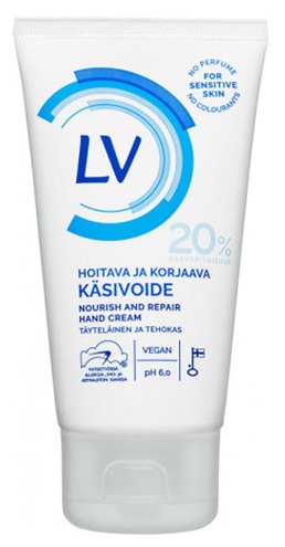 Гипоаллергенный крем для рук LV содержит 12 % жировых компонентов, масло ши и аллантоин. Без запаха. Крем делает кожу рук мягкой, упругой, без ощущения жирности. Для всех типов кожи рук. Имеет легкую ... Показать описаниетекстуру. Легко наносится и быстро впитывается. Vegan. Оптимальный 6,5 PH. Продукция не тестируется на животных. Гипоаллергенный продукт. Разработан в сотрудничестве с "Союзом против аллергии и астмы Финляндии". Сделано в Финляндии.
