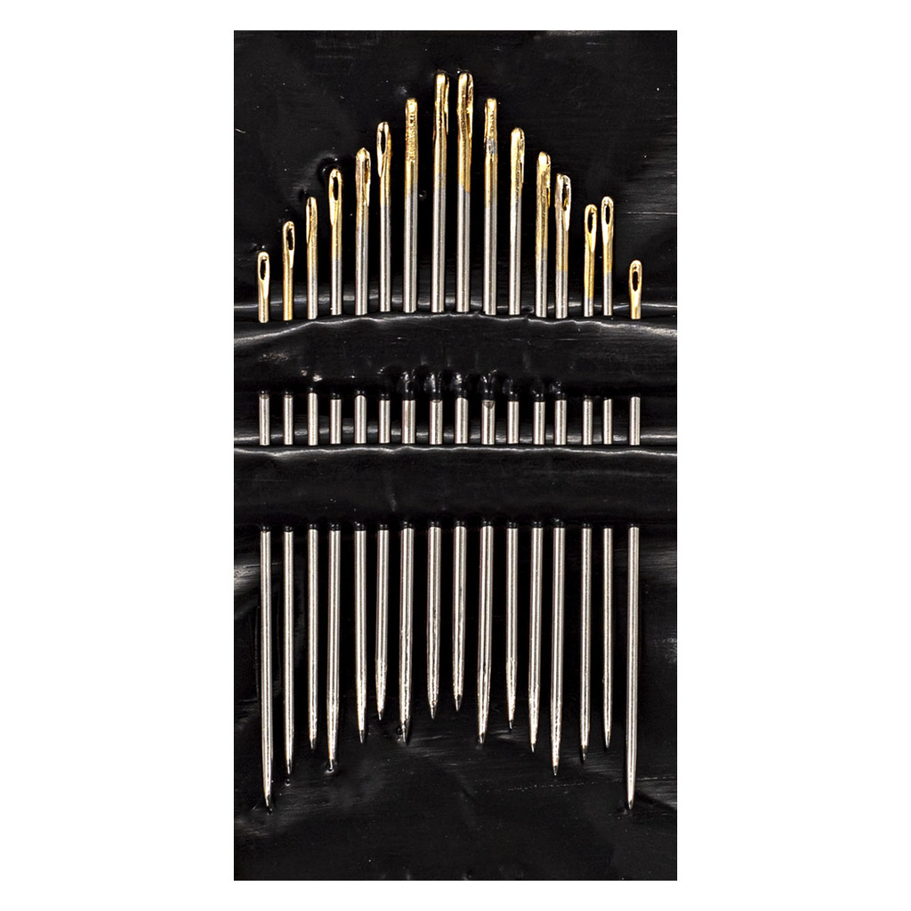 Комплект из 16 острых игл подходит для любого вида ручного шитья, включая наметку, ремонт текстиля или вышивку. Ушко иглы позолочено, поэтому вдевать в него нить удобно даже при ослабленном зрении. Из... Показать описаниеготовлены из высокоуглеродистой стали с хромированным покрытием, устойчивы к появлению коррозии. При правильном использовании такие иглы прослужат вам долго. Чтобы защитить пальцы от случайного травмирования, при работе с иглами используйте наперсток. Оптимальное место хранения игл – закрытый футляр или игольница с магнитным основанием. Номер иглы: №1-5
