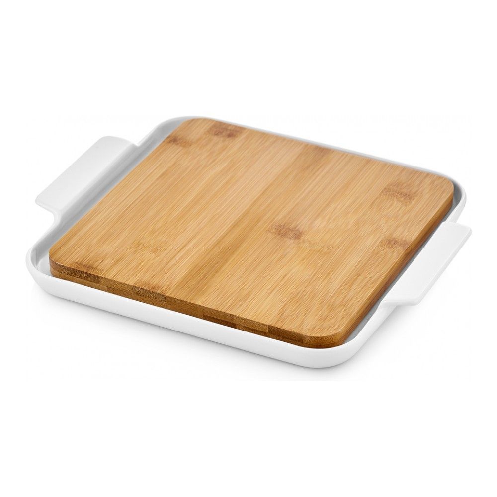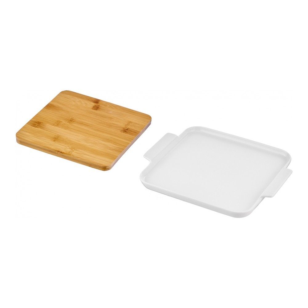 Цвет: белый; габариты: 26х26х2 см; вес: 0.89 кг; материал: бамбук, фарфор; серия: Bamboo. Что будет, если соединить лаконичность фарфора с теплом натурального дерева? Будет серия посуды для сервировки... Показать описание Bamboo!. Эта линейка соответствует ожиданиям очень многих. Она придется по вкусу любителям натуральных материалов: посуда выполнена из бамбука, впитывающего наполовину меньше влаги, чем любая другая древесина, и минерального термостойкого фарфора. Ее оценят компании: нет ничего проще, чем устроить дома коктейльную вечеринку с такими наборами. Популярность полезных снэков, любовь к соусам различных национальных кухонь – все это находит отражение в линейке Bamboo. Минеральный упрочненный фарфор может использоваться как профессиональный в HoReCa. Этот материал отличают:. * Высокая ударопрочность. Это стало возможным с помощью легирующих, то есть добавленных для улучшения свойств, компонентов в состав керамической массы;. * Легкость мытья. Благодаря специальному составу глазури легко мыть даже посуду с присохшей грязью;. * Высокая устойчивость к температурным перепадам. Посуду можно использовать в микроволновой печи, посудомоечной машине, холодильнике и даже духовке. Обратите внимание: фарфоровую часть наборов можно мыть в посудомойке и ставить в микроволновку, а бамбук – нельзя. Сервировочное блюдо Bamboo имеет большой диаметр и оригинальную конструкцию. Поместите на бамбуковое плато сухие продукты, а по краям – фрукты, джемы, соусы, нарезку. Пусть гости сами составляют канапе по душе: с крекерами и сыром, ломтиками багета и прошутто – вариантов может быть множество. В линейку сервировочной посуды Bamboo, кроме того, входят двух- и трехсекционные менажницы и кружка с блюдцем.
