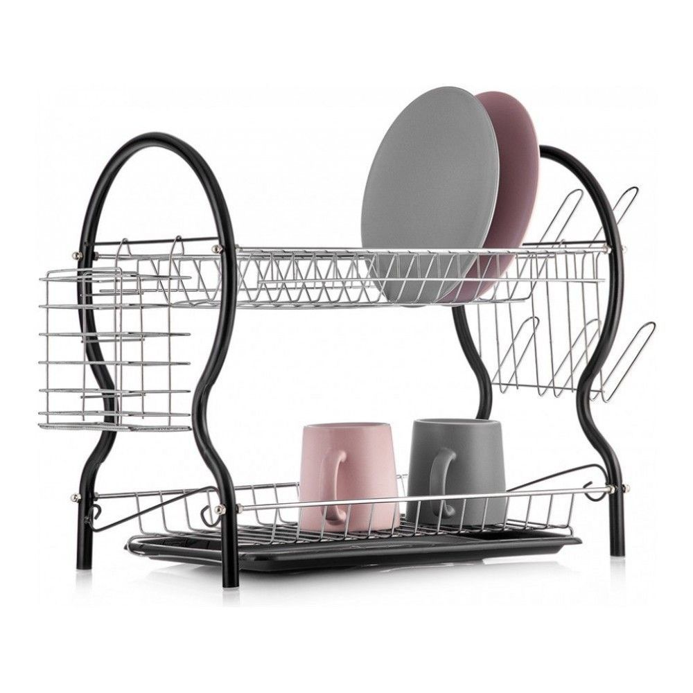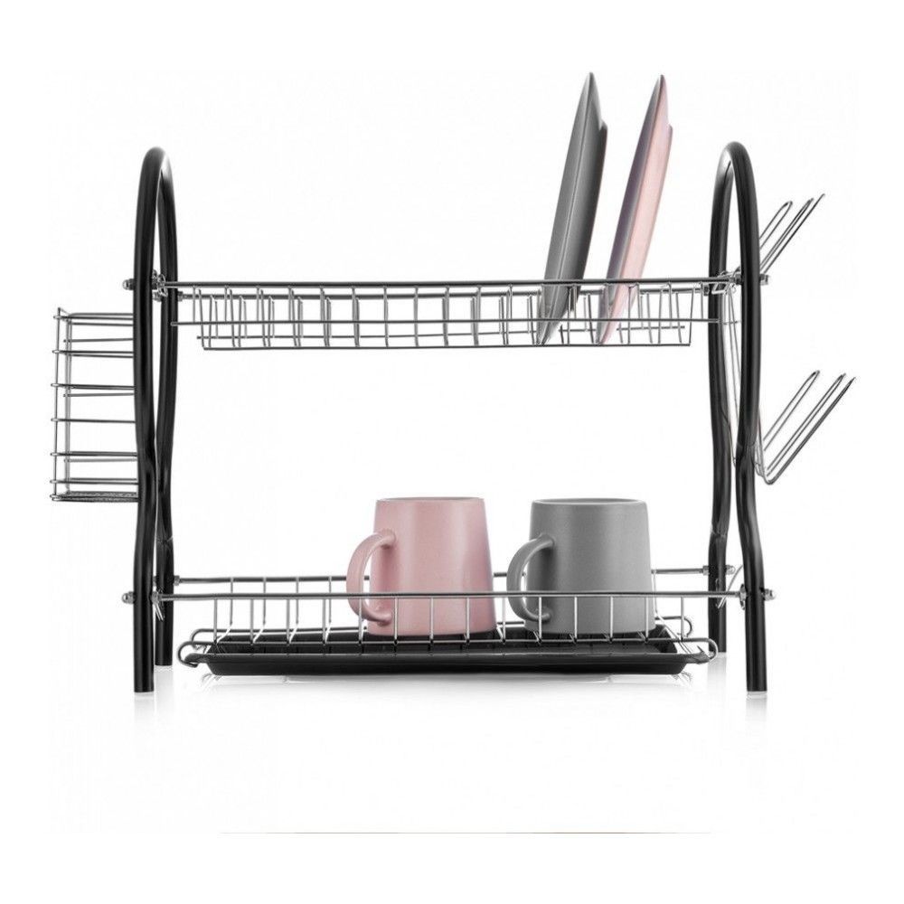 Cушилка для посуды 2-ярусная LUCIA, с поддоном и держателями для стаканов и столовых приборов, черная, 52х24.5х40 смВопросы по товару