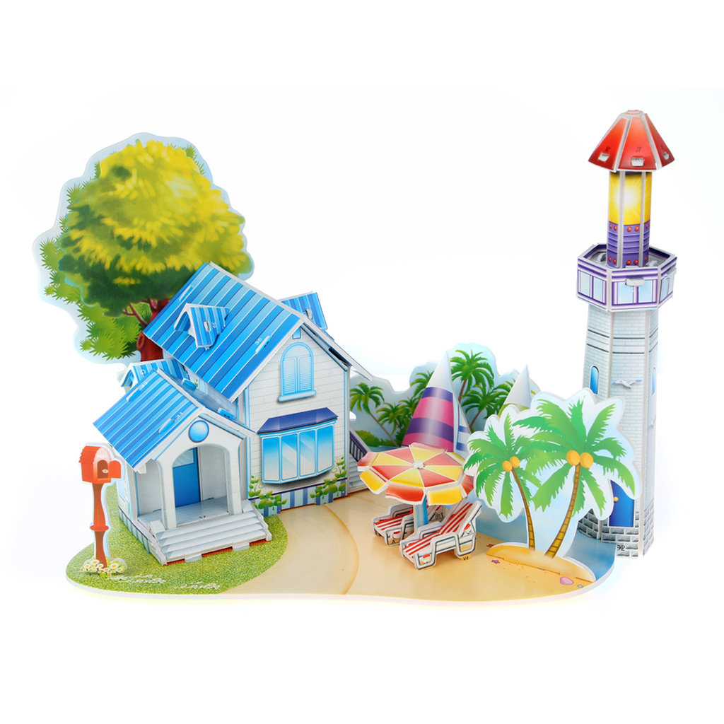 Из деталей 3Д пазла можно собрать модель романтического пляжа с пальмами. На пляже стоит спасательная станция, домик для отдыхающих, шезлонг для желающих полежать на берегу. Для комфортного отдыха над... Показать описание шезлонгами установлена зонтики от солнца. В роли инструкции выступает нумерация на деталях, которая определяет ход сборки. Благодаря качественной подгонке детали легко соединяются между собой, при этом готовый пазл достаточно устойчив и может использоваться для дальнейших сюжетных игр. Размер в сборке: 27,5х20х19,8 Количество деталей: 39 шт.