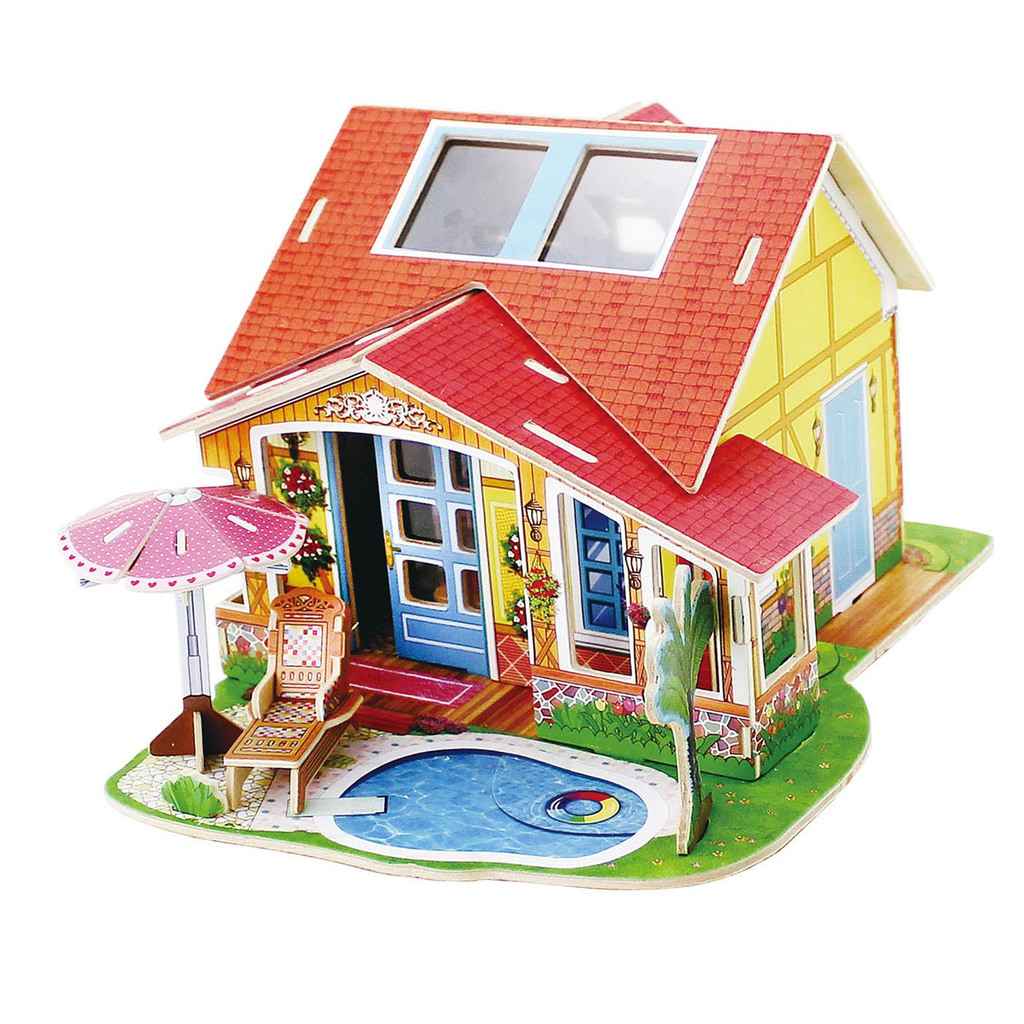 Из деревянных деталей с красочным бумажным покрытием можно собрать модель ванной комнаты. В мансардном этаже присутствуют два больших окна, которые дают доступ солнечному свету. На входе стоит шезлонг... Показать описание и зонтик от солнца. Рядом со входом устроен большой бассейн. В нем есть даже спасательный круг для тех, кто чувствует себя неуверенным на воде. Вход в здание украшают светильники и ампельные цветы. Модель собирается без клея. Материал: натуральное дерево. Размер после сборки: 25,5x17x14x5 см. Размер коробки: 35,5x33x25,5 см Количество деталей: 19 Размер единицы товара: 30,0x22,5x0,3 см В наборе: листы фанеры с деталями 5 шт., инструкция.
