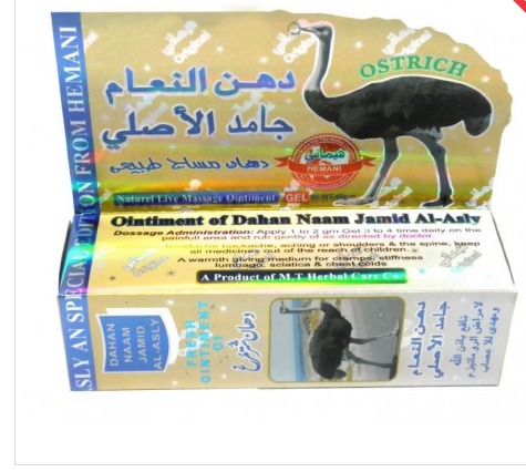 В традиционное медицине страусиный жир используется как средство для лечения болей в суставах, мышечных болях. Страусинный жир, благодаря наличию фосфолипидов и натуральных глицерин-производных быстро... Показать описание и глубоко проникает в подкожные слои, помогая действующим компонентам мази действовать на больные ткани и суставы. Также жир страуса эму (африканского) – является прекрасным противовоспалительным средством. Состав: гаультерия (природное противовоспалительное средство), эвкалипт (снятие воспаления), тимьян (природный антисептик), мята полевая (природный ментол), бутоны гвоздики (противоревматическое средство), масло оливы, черный тмин (лечебное средство), животный жир (жир страуса). Мазь имеет удобную гелевую форму выпуска, благодаря чему ее очень удобно наносить в нужных количествах. Применение: нанести небольшое количество геля на проблемную область, тщательно втереть до того момента пока крем полностью не впитается в кожу. Предостережение: - Не применять на открытые раны и слизистые оболочки тела - Не применять детям до 3-х лет