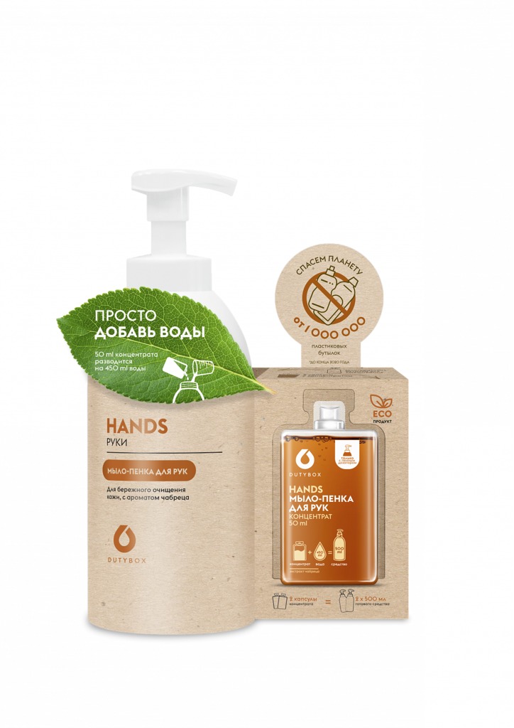 Экологиченое Гипоаллергенное Мыло для рук Dutybox с ароматом Чабреца, 1000мл готового средства. Сменные блоки к набору Арт db-7115 . 2 капсулы с концентратом по 50мл. Каждая капсула разбавляется на 50... Показать описание0мл готового продукта. Увлажняющее жидкое мыло-пенка подходит для использования с первых дней жизни, 0+. Благодаря входящим в состав смягчающим компонентам сохраняет защитные функции кожи, деликатно очищает не вызывая сухости и раздражения. Специальный пенный дозатор обеспечивает экономичный расход. Жидкое мыло не содержит фосфатов, SLES и SLS, при этом идеально справятся с загрязнениями, оставаясь абсолютно безопасными и экологичными для людей и животных. Способ применения: отрежьте ножницами горлышко одной капсулы и смешайте её содержимое с 450 мл тёплой воды, накрутите дозатор и перемешайте. Готовое средство предназначено только для пенного дозатора.