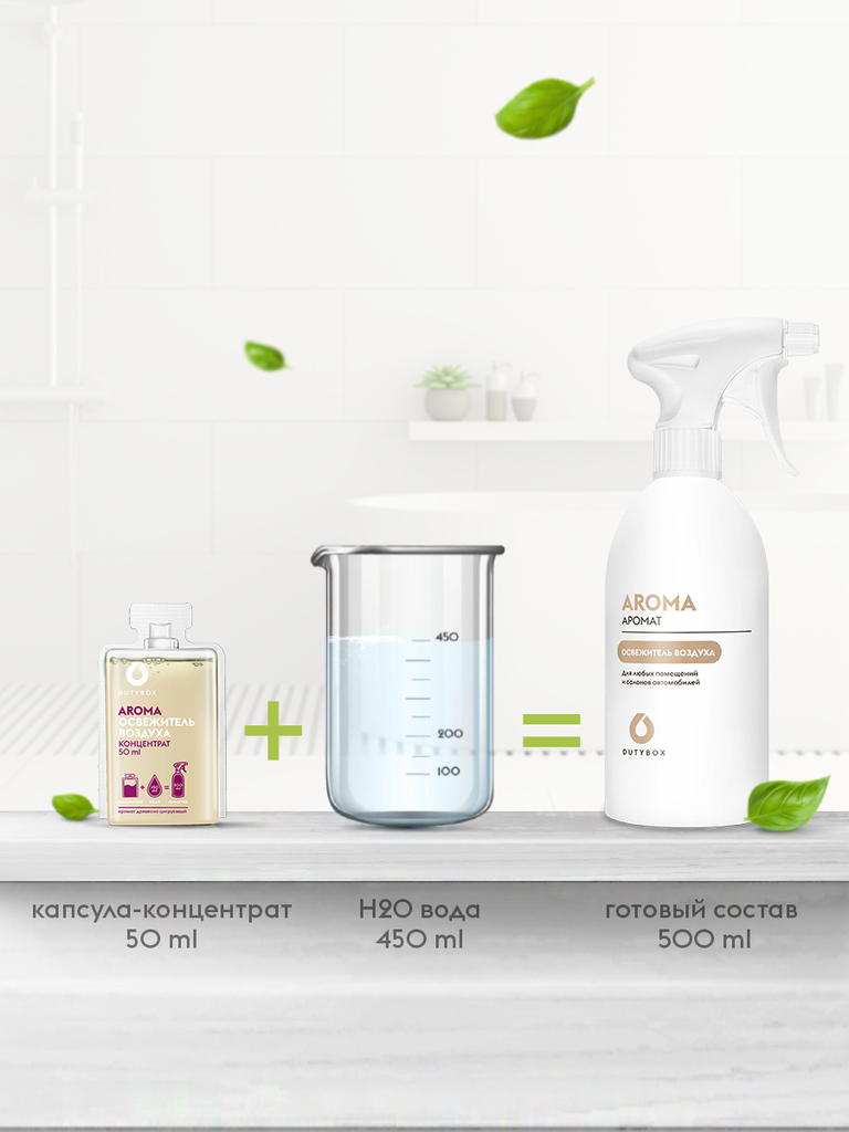 Назначение: Эффективно устраняет неприятные запахи и освежает воздух. Подходит для ароматизации воздуха в помещениях различного типа и в автомобиле, не оставляет следов на обивке, ткани, мебели, обоях... Показать описание. Способ применения: Налить в бутылку для средства «Aroma» 450 мл теплой воды. Аккуратно отрезать горлышко капсулы. Вылить содержимое капсулы в бутылку с водой. Накрутить на горло бутылки распылитель и перемешать. Готовое средство распылять одним-двумя нажатиями в центре помещения. Состав: ≥30% вода очищенная; ≥5%, но <15%: ароматизирующая добавка, неионогенные ПАВ; <5%: изопропанол, комплексообразователь, консервант, краситель. Условия хранения: Хранить в сухом прохладном месте при температуре: +5°С до +35°С. Избегать попадания прямого солнечного света. Открытую капсулу утилизировать.