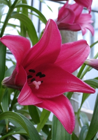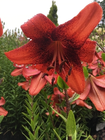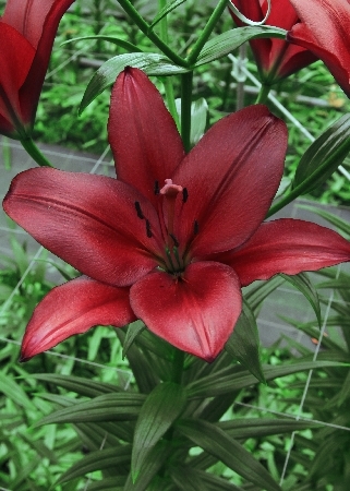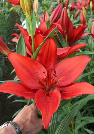 очень крупный цветок, ярко-алый с небольшим темным крапом, H-100см