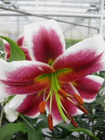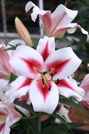 белый с желтоватым центром, оранжевые тычинки очень крупные цветки, H-110см