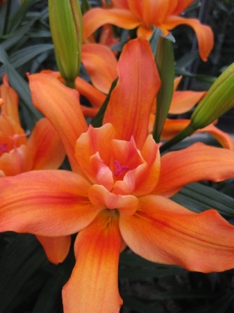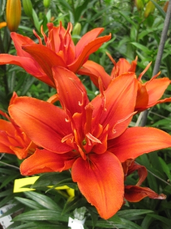 Махровый, крупные цветки 18см, необычная форма внутренних лепестков, цвет ярко-оранжевый внутри, и более светлый к кончикам лепестков, похож на пламя., H-100см