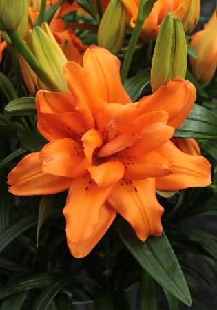 оранжевый с редким тёмным крапом в самом центре, махровый, H-100см