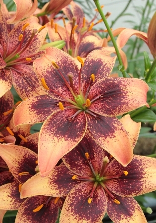 оранжевый с бордовым крапом, меняется до кремового с лаймовым центром, бордовым крапом и розовым румянцем, махровый, H-100см