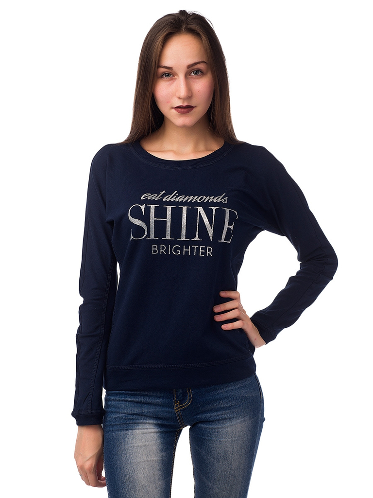 Больше картинок (информации) и таблица размеров на странице. Женский свитшот классического кроя: приталенный силуэт, длинные, облегающие руку рукава с манжетами, круглый вырез горловины. Цвет тёмно-синий. Материал 2-хниточный футер с небольшим добавлением лайкры. На груди свитшот украшен надписью. Оригинальная и в то же время удобная вещь для повседневного гардероба. Легко стирается, хорошо сидит по фигуре. Комбинируется практически со всеми вещами, кроме строгих классических нарядов. Материал: 95% хлопок, 5% ПУ. Пол: женский. Сезон: круглогодичный. Материал: хлопок. Производитель: Узбекистан