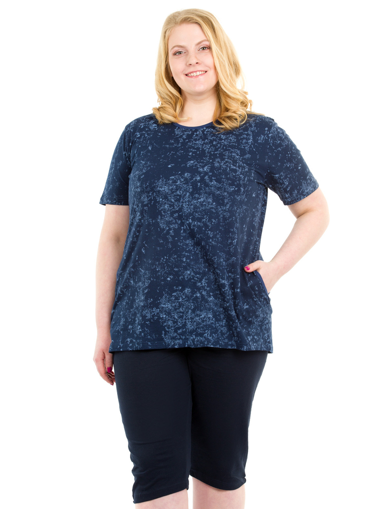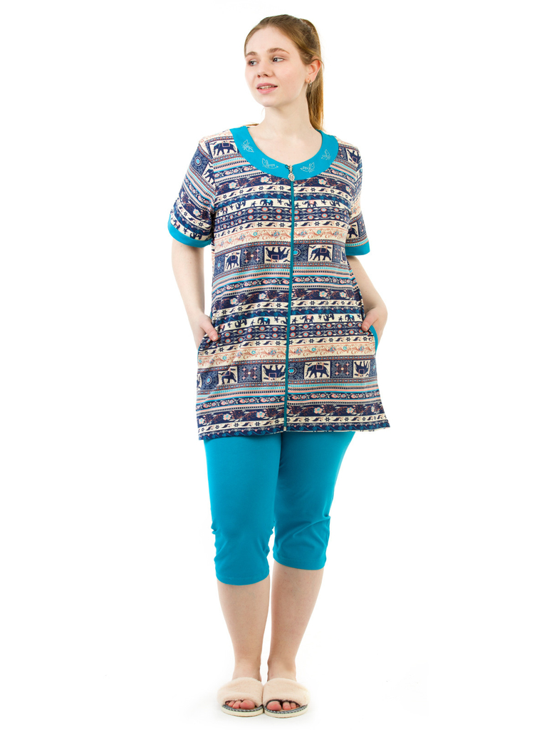 Больше картинок (информации) и таблица размеров на странице. Комплект женский (туника/капри), цвет темно-синий, с рисунком. Материал: 100% Хлопок. Пол: женский. Материал: хлопок. Производитель: Узбекистан