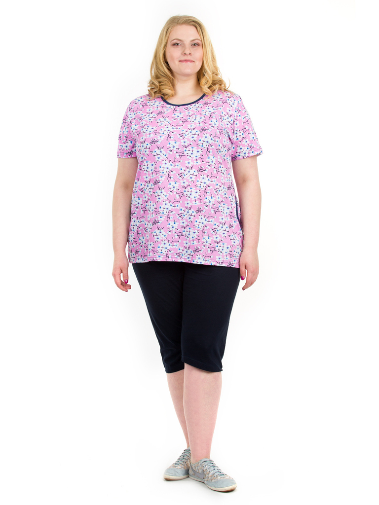 Больше картинок (информации) и таблица размеров на странице. Комплект женский (туника/капри), цвет пудрово-розовый, с рисунком. Материал: 100% Хлопок. Пол: женский. Материал: хлопок. Производитель: Узбекистан