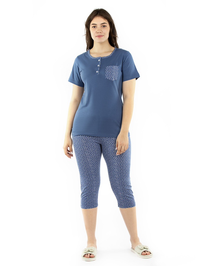 Больше картинок (информации) и таблица размеров на странице. Комплект домашний женский (футболка и капри), набивка-рисунок, цвет синий. Декорирован комплект накладным карманом на груди. Материал-100% Хлопок. Тип ткани-Кулирная гладь (супрем). Маломерит на 1 размер. ПОДАРОК В КАЖДОМ КОМПЛЕКТЕ! Материал: 100% Хлопок. Пол: женский. Материал: хлопок. Производитель: Узбекистан