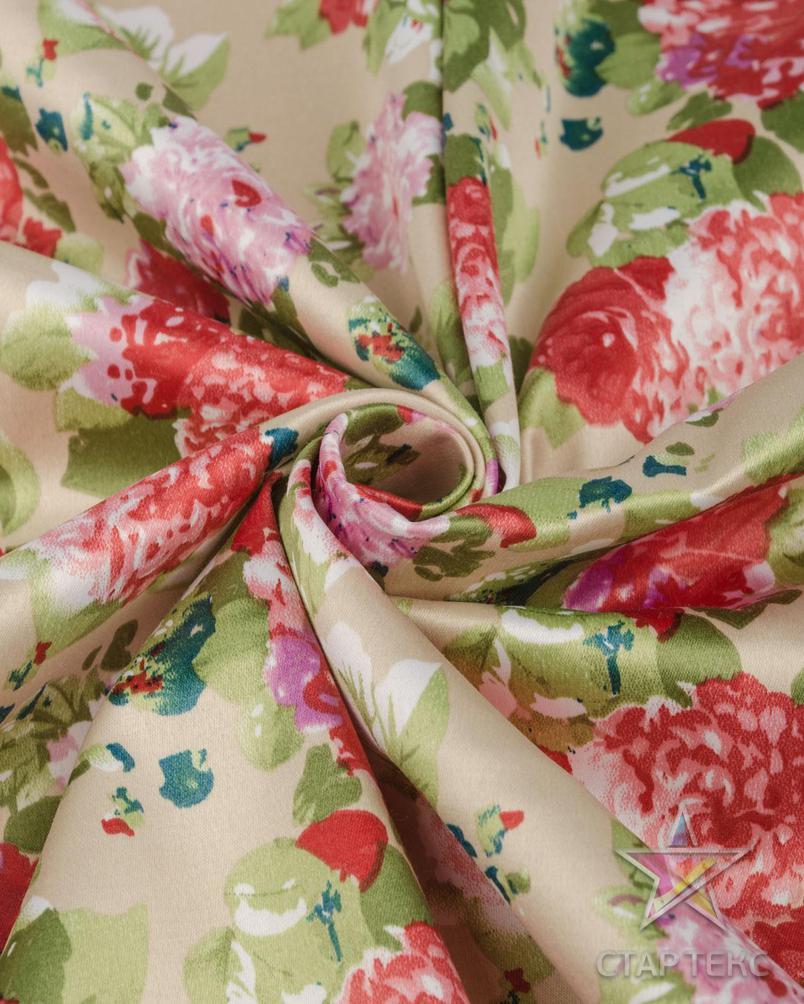 Тонкая гладкая ткань с принтом. Поверхность полотна ровная, плотная с матовым блеском. Материал эластичный, при драпировке образует мягкие струящиеся складки. Из данной ткани шьют нижнее белье, постел... Показать описаниеьное белье, топы, сарафаны, вечерние платья, юбки, рубашки и блузки. Состав 97% п/э, 3% спандекс. Плотность 144 гр/м.пог. Ширина150 см.