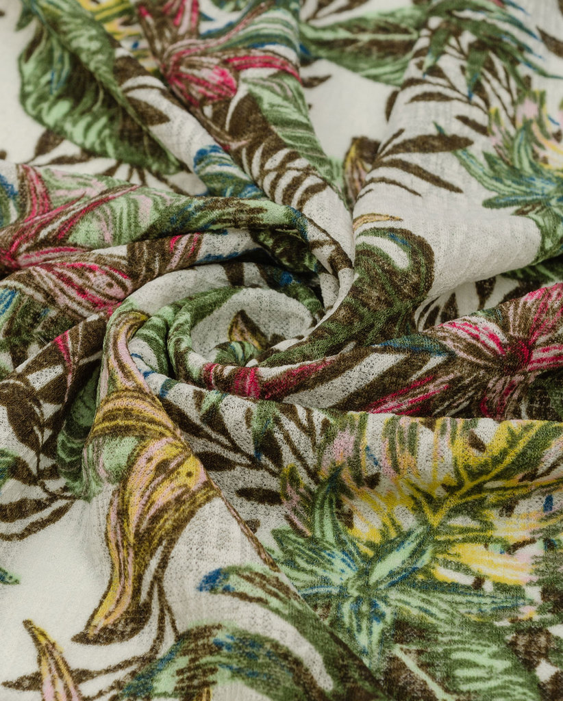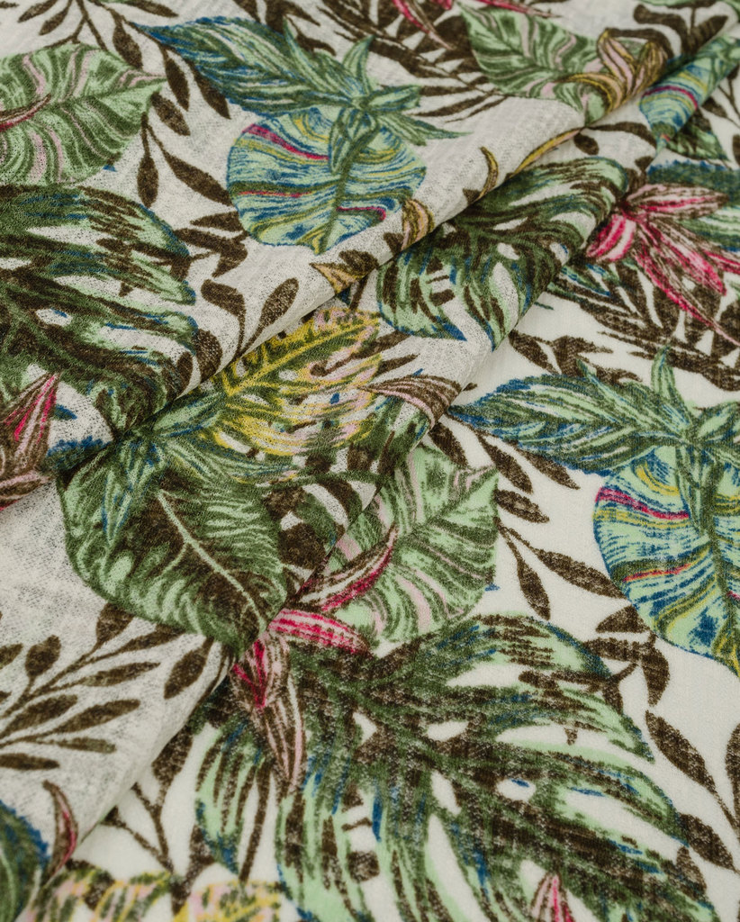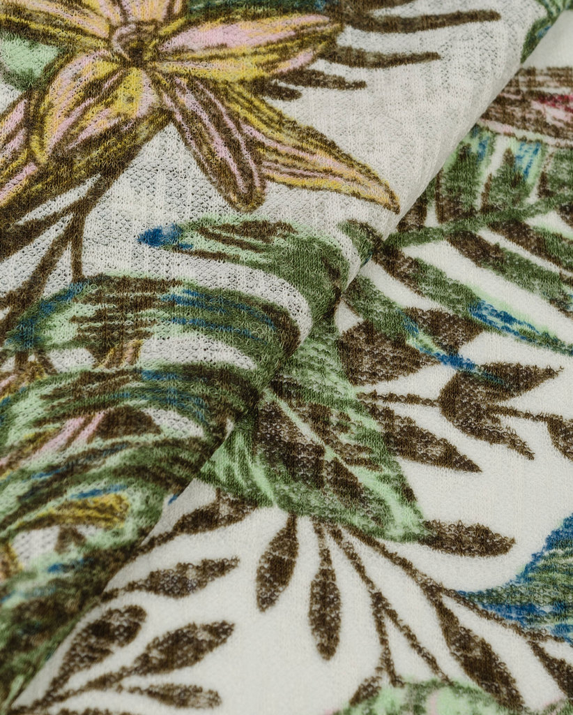 Трикотажное полотно средней плотности с меланжевой отделкой. Лицевая сторона ровная, гладкая. Изнаночная - мягкая, матовая, бархатистая. На поверхности полотна расположен растительный принт. Состав 60... Показать описание% п/э, 35% вискоза, 5% спандекс. Плотность 360 гр/м.пог. Ширина 150 см.