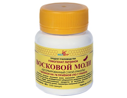Состав: перемолотые личинки восковой моли – 14%, лактоза – 81%, фруктоза – 5%. Показания к применению: сердечнососудистые заболевания: стенокардия, ишемия, инфаркт миокарда, гипертоническая болезнь, у... Показать описаниевеличение щитовидной железы туберкулез легких и внелёгочные туберкулезные патологии бесплодие (невынашивание) доброкачественные опухоли матки и молочных желез простатит и аденома предстательной железы заболевание бронхов у детей Способ применения: принимают по 7 гранул под язык до полного рассасывания 2-3 раза в сутки за 10 - 20 минут до еды. При туберкулезе следует увеличить дозу до 15 гранул. Курсы приема 2 месяца, перерыв между курсами 21 день. Детям от 6 до 14 лет принимать по 3-4 гранулы, курс 21 день, затем перерыв 21 день.