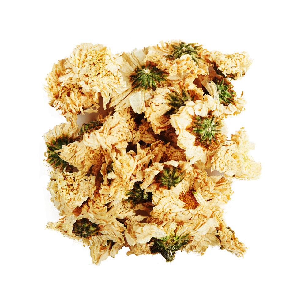 Сушёный цвет хризантемы — основа традиционного китайского напитка, обладающего лекарственными свойствами. Обычно цвет хризантемы заваривается в качестве дополнения к зелёному чаю или пуэру, но иногда ... Показать описаниеупотребляется и как самостоятельный напиток. Высоко ценятся его лекарственные свойства: хризантему используют при лечении заболеваний верхних дыхательных путей, при повышенной возбудимости. Она обладает успокаивающими свойствами, благодаря высокому содержанию микроэлементов оказывает общеукрепляющее воздействие на ЦНС и организм в целом. В сухом виде — мелкие белые цветки с горьковатым запахом хризантемы. Настой изумрудно-зелёного цвета, вкус сладковатый, цветочный, аромат свежий, с пряными нотками. Чаю хризантема придаёт лёгкий цветочный аромат, сохраняя естественный вкус напитка. Заваривать при температуре 80-85 °C, 2 чайных ложки на чайник 450 мл, в течение 1-3 мин. Для проливного метода — 8 граммов заварки на гайвань или колбу типода, в течение 5-15 сек. Можно заваривать с молоком: на 1 стакан молока — 20 цветков. В чай добавляют по вкусу.
