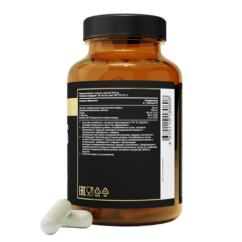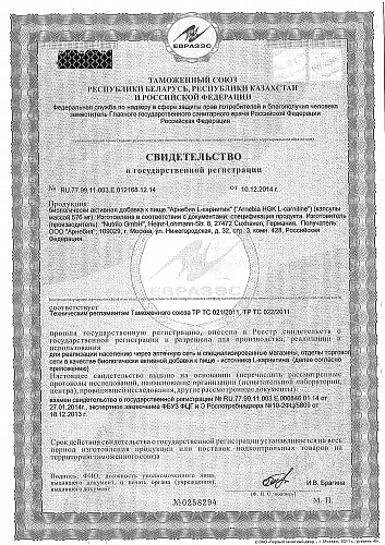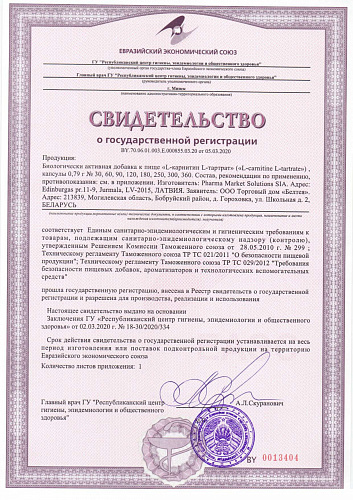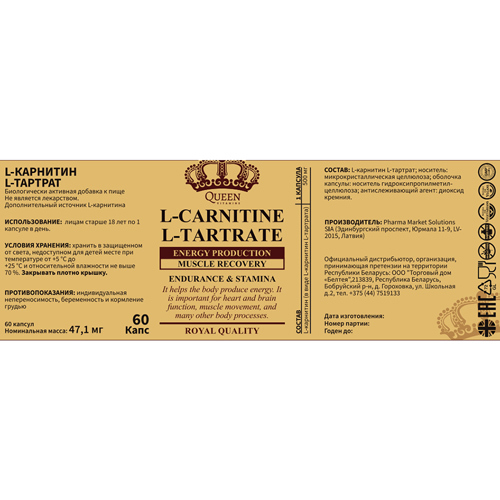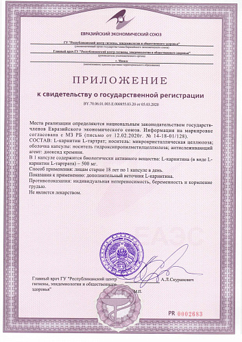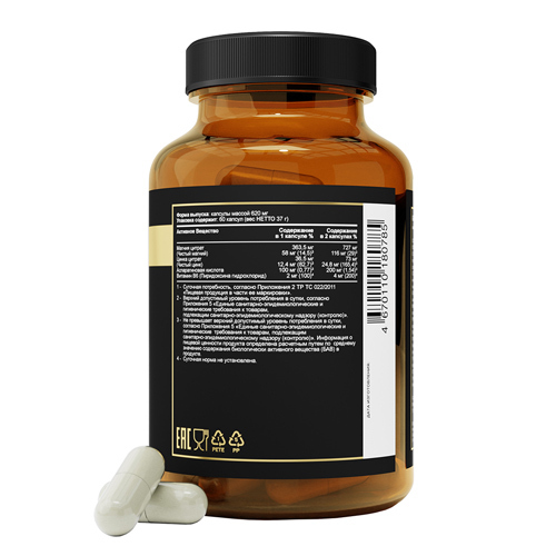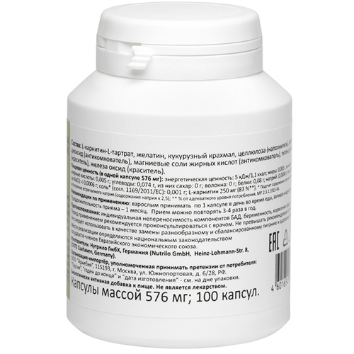 Ровно полвека назад ученым удалось определить роль L-карнитина он переносит жирные кислоты через внутренние мембраны митохондрий, в которых жиры расщепляются и преобразуются в энергию. В организм это ... Показать описаниевещество поступает как из пищи (мясо, птица, рыба, молочные продукты, яйца), так и образуется в нем из других аминокислот в присутствии витамина С и железа. L-карнитин активно используется для метаболизма жиров и нормальной работы сердца, мозга, нервной системы. Это биологически активное вещество ускоряет расщепление жиров, переводя их в энергию, столь необходимую для длительных и пока непривычных организму тренировок. L-карнитин также используют для повышения выносливости, особенно во время спортивных занятий. Потребность в карнитине индивидуальна (в среднем 200-500 мг в сутки для взрослого человека), значительно повышается (в 4-20 раз) при умственных, физических и эмоциональных нагрузках, заболеваниях и функционально особых состояниях (стресс, беременность, кормление грудью, спорт и т. п.). Недостаток или нарушение усвоения L-карнитина в мышцах или клетках сердца приводят к ухудшению процессов ?окисления, что вызывает различные мышечные или сердечные болезни. L-карнитин принимает участие не только в метаболизме жиров. Даже в тех случаях, когда энергия поступает за счет белков и углеводов, он вносит свой вклад в соответствующие метаболические реакции. Другая важная функция карнитина заключается в его способности очищать организм. Он образует соединения с различными токсинами продуктами обмена веществ. Эти комплексы затем выводятся из организма через почки. Рекомендуется в качестве источника L-карнитина. L-карнитин это аминокислота, по своей структуре родственная витаминам группы В. Прием БАД к пище в рекомендуемой дозе (1 капсула в день) обеспечивает адекватный уровень потребления L-карнитина на 83% (250 мг). Биологически активная добавка к пище (не является лекарством). ОЗНАКОМИТЬСЯ СО СПОСОБОМ ПРИМЕНЕН