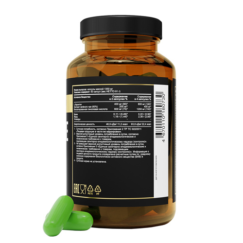 Сбалансированный синергетический комплекс для активации сжигания жира и достижения желаемой фигуры. CLA воздействует на фермент липазу, которая отвечает за транспортировку жира, уменьшает количество ж... Показать описаниеировых отложений, не затрагивая мышечную ткань, способствует более выраженному рельефу. L-CARNITINE улучшает энергетический обмен в организме, способствует преобразованию жира в энергию, повышает работоспособность и выносливость. Экстракт зеленого чая его активные вещества участвуют в регуляции липидного и углеводного обмена повышают работоспособность, защищают клетки организма от разрушительного воздействия свободных радикалов. ОЗНАКОМИТЬСЯ СО СПОСОБОМ ПРИМЕНЕНИЯ И ОТЗЫВАМИ МОЖНО ПО ЭТОЙ ССЫЛКЕ