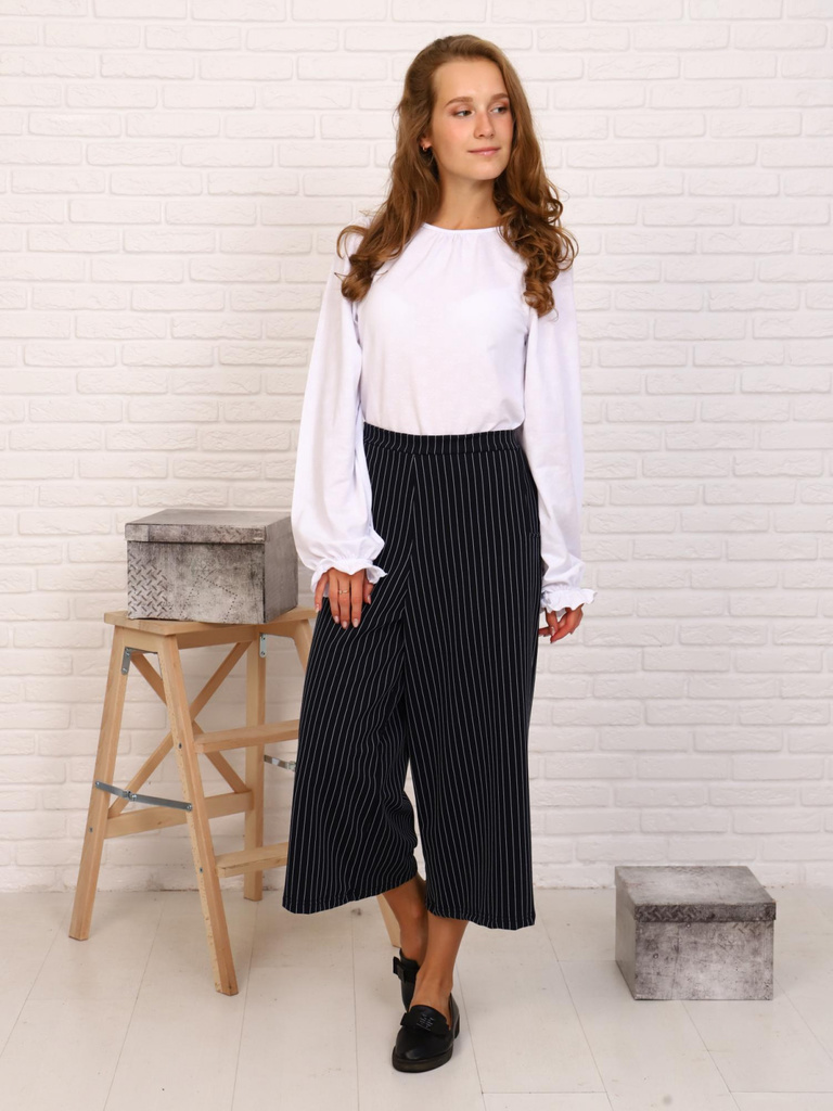 Цвет: синий.Состав: вискоза 68%, 20% нейлон, 12% лайкра.Материал: трикотажное полотно Брюки для девочки-подростка в полоску. Школьные кюлоты сшиты из плотного эластичного трикотажного полотна. Подрост... Показать описаниековые штаны в классическом стиле, слегка расклешенные к низу, с карманами сзади. Высокая талия школьных брюк обеспечивает удобную посадку, подчеркивает талию и создает модный силуэт. Отлично подойдут для делового и повседневного образа. Детские брючки можно сочетать с футболкой, блузкой, лонгсливом, водолазкой, жилетом, джемпером, кофтой, кардиганом, толстовкой, свитшотом, худи. Подростковые брюки палаццо подойдут для прогулок, праздников, вечеринок, похода в гости, экскурсий, школы, кружков, Как отличный подарок. Стильная модель как нельзя лучше подойдет девушкам любого возраста. Будем рады, если вы оставите отзыв о нашей продукции !