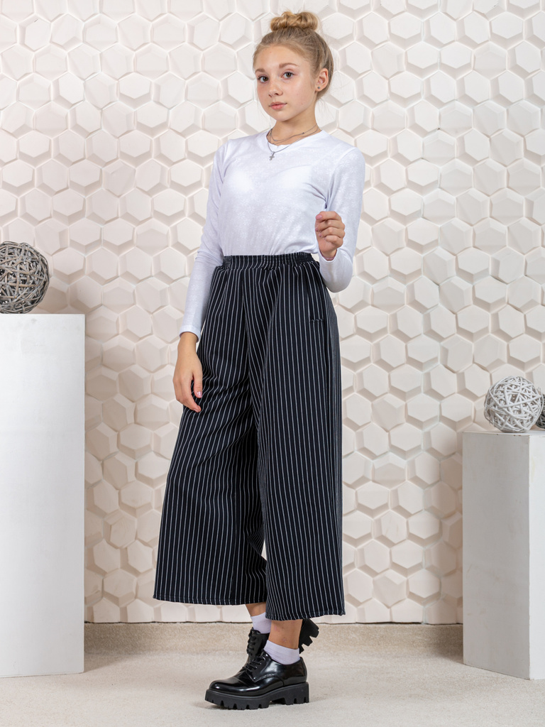 Цвет: черный.Состав: вискоза 68%, 20% нейлон, 12% лайкра.Материал: трикотажное полотно Брюки для девочки-подростка в полоску. Школьные кюлоты сшиты из плотного эластичного трикотажного полотна. Подрос... Показать описаниетковые штаны в классическом стиле, слегка расклешенные к низу, с карманами сзади. Высокая талия школьных брюк обеспечивает удобную посадку, подчеркивает талию и создает модный силуэт. Отлично подойдут для делового и повседневного образа. Детские брючки можно сочетать с футболкой, блузкой, лонгсливом, водолазкой, жилетом, джемпером, кофтой, кардиганом, толстовкой, свитшотом, худи. Подростковые брюки палаццо подойдут для прогулок, праздников, вечеринок, похода в гости, экскурсий, школы, кружков, Как отличный подарок. Стильная модель как нельзя лучше подойдет девушкам любого возраста. Будем рады, если вы оставите отзыв о нашей продукции !
