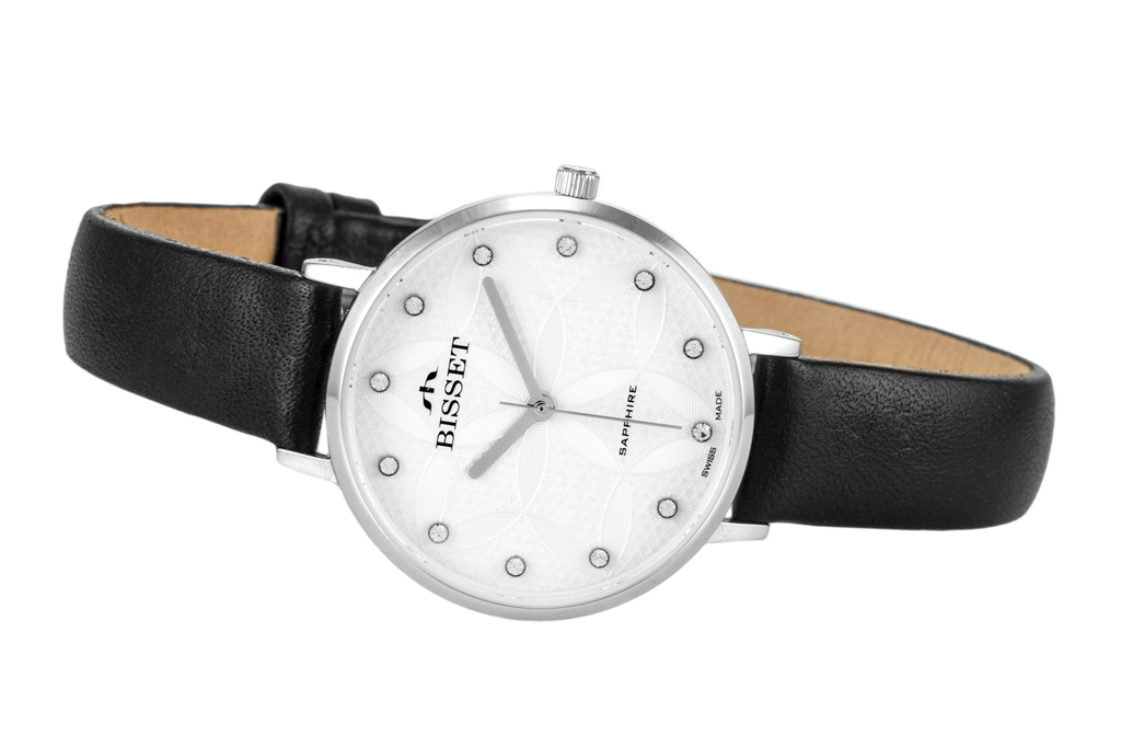 Женские часы BISSET. Модель BISSET BSAF29 SAPPHIRE. Механизм: RONDA SWISS EOL (Швейцария). Материал корпуса: стальной корпус, сталь 316L. Размеры корпуса: ширина 35 мм, высота 35 мм, толщина 75 ... Показать описаниемм. Водонепроницаемые: 3ATM. Ремешок: кожаный ремешок. Застежка: классическая. Стекло: сапфировое, устойчивое к царапинам. Функции: часы, минуты, секунды. Вес: 38 гр. Производство: Швейцария, фирма BISSET. Цвет как на фото. Подарочная коробка в комплекте.