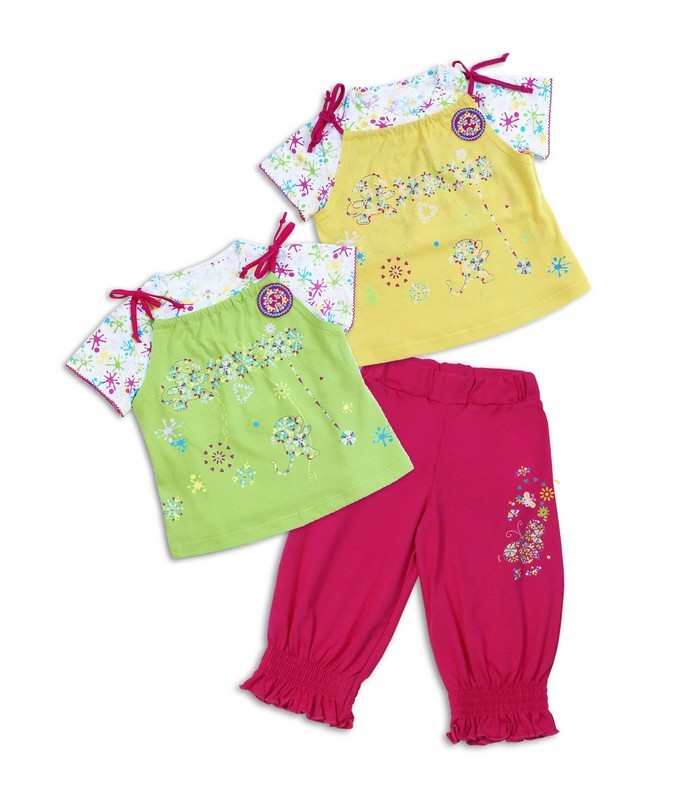 Состав: кулир / хлопок 100%. Симпатичный комплект, состоящий из двух джемперов и брюк, выполнен из мягкого полотна. Джемпера с короткими рукавами декорированы дизайнерским принтом, нашивкой и яркими з... Показать описаниеавязочками. Брюки на широком эластичном поясе имеют резинку по низу, декорированы штучной печатью. Оригинальный дизайн и модная расцветка делают этот комплект незаменимым предметом детского гардероба. Рекомендуется машинная стирка при 40 градусах без предварительного замачивания.