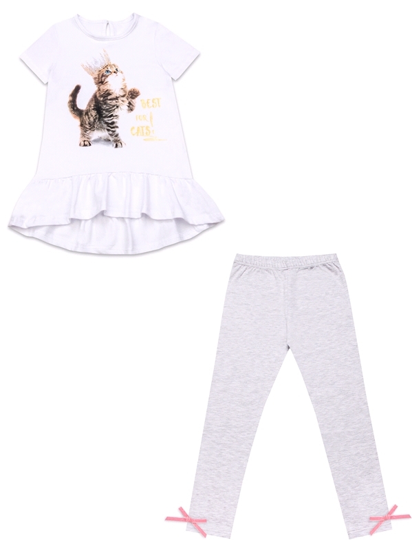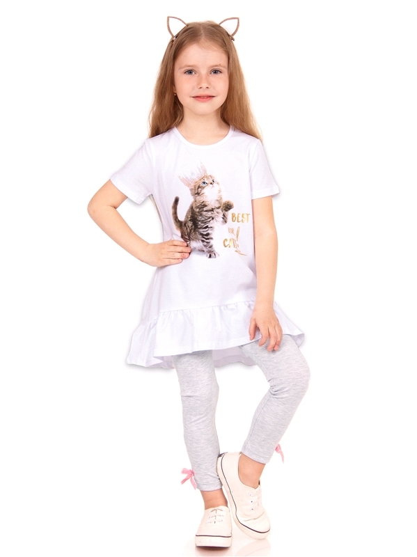 Состав: кулир с лайкрой / хлопок 92% + лайкра 8%, хлопок 68% + ПЭ 24% + лайкра 8%. Комплект для девочки из футболки и шорт выполнен из легкого хлопкового полотна с лайкрой. Туника с короткими рукавами... Показать описание, украшена оборкой и милым дизайнерским принтом с котенком. Леггинсы свободно-облегающего кроя, на эластичном поясе, украшены маленькими бантиками. Уход: только машинная стирка (руками не стирать!) при температуре 40 градусов, без предварительного замачивания. Изделия с печатью и декором перед стиркой необходимо вывернуть на изнаночную сторону.