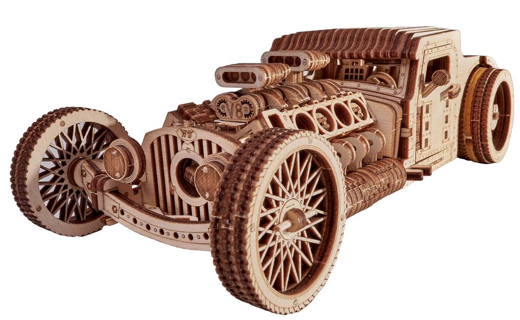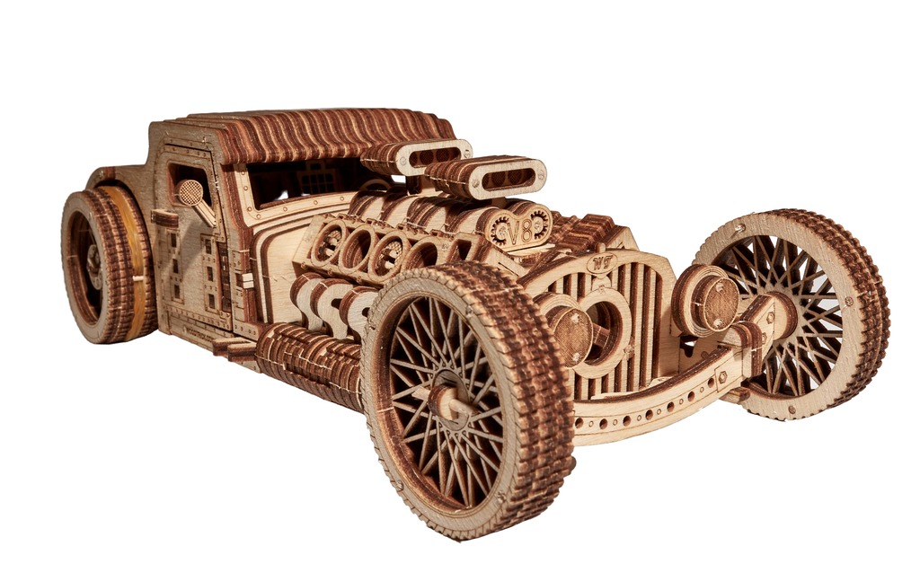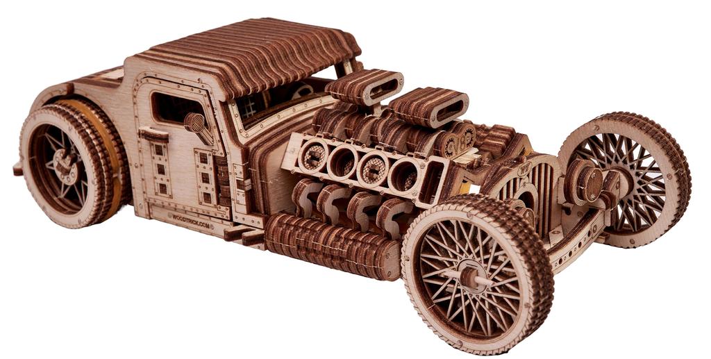 ССЫЛКА НА ПОДРОБНОЕ ОПИСАНИЕ И ДОПОЛНИТЕЛЬНЫЕ ФОТО Горячий нрав, свобода двигателей, яркий корпус и изумительный вид –; это настоящий Хот Род, монстр родстер. Wood Trick смогла передать всю красоту этих кастомных автомобилей. Специально для Ассоциации Хот Род была создана эта потрясающая сборная модель. Мы знаем, что вы действительно любите что-то эдакое, винтажное, классическое и воистину сумасшедшее, поэтому Wood Trick не смог обойти тему железных красавцев 30-40х годов. В деревянном конструкторе ярко выделен двигатель V8, классический кузов, спицевые разноширокие колеса, проработанный салон. В конструкторе из дерева Хот Род удалось реализовать все кастомные элементы от решетки радиатора и;двигателя до спортивного шасси. Колеса в деревянном гоночном родстере обтянуты резиной, чтобы развивать большую скорость. Количество деталей в модели "Хот Род" - 280. Этот конструктор проезжает порядка 6-7 метров. Заводка осуществляется специальным ключом, наличие коробки передач дает возможность модели двигаться одинаково, в обе стороны. Спуск интуитивно понятен в работе. Деревянный конструктор "Хот Род" компании "Wood Trick", способен набирать максимально возможную скорость. Эта модель идеально подойдет как для подарка, так и семейного развлечения. Сборная модель из дерева собирается без клея с помощью деревянных зубочисток. В наборе есть все необходимое для сборки, включая яркую цветную глянцевую инструкцию. Конструктор уже в яркой подарочной упаковке и его можно смело дарить своим друзья.