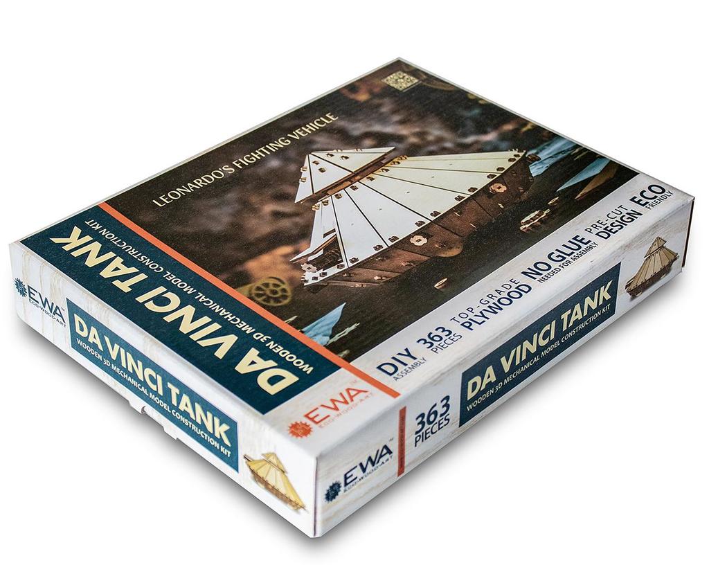 ССЫЛКА НА ПОДРОБНОЕ ОПИСАНИЕ И ДОПОЛНИТЕЛЬНЫЕ ФОТО Танк эпохи Возрождения - сборная механическая 3D-модель Танк Да Винчи от компании Eco Wood Art (Беларусь). Разработка великого итальянского изобретателя, художника и учёного - Леонардо да Винчи, реализованная в уменьшенном масштабе. В модели предусмотрен экологичный резиномотор дополненный механизмом запуска и остановки, при помощи которых танк; двигается как задумал великий изобретатель. Модель предназначена для самостоятельной сборки без клея и доставит удовольствие детям и взрослым. Отличный подарок и замечательный предмет классического интерьера.