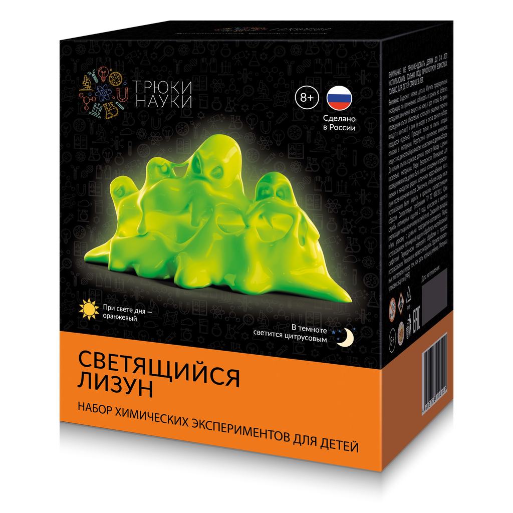 ССЫЛКА НА ПОДРОБНОЕ ОПИСАНИЕ И ДОПОЛНИТЕЛЬНЫЕ ФОТО Набор химических экспериментов для детей: "Светящийся лизун" при свете дня - оранжевый, в темноте светится цитрусовым. Реагентов хватает на несколько исполнений.