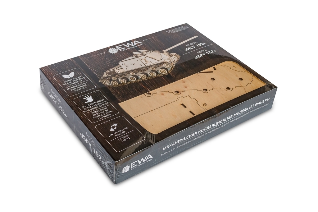 ССЫЛКА НА ПОДРОБНОЕ ОПИСАНИЕ И ДОПОЛНИТЕЛЬНЫЕ ФОТО Сборная модель из дерева Eco Wood Art ИСУ-152 большого размера. Собирается с помощью клея и огромного желания обладателя такого шикарного набора. Модель максимально приближена к оригиналу, все детали выполнены из березовой фанеры, а аромат древесины не оставит вас равнодушными. Исторические факты о ISU-152: ИСУ-152 (Объект 241) — советская тяжёлая самоходно-артиллерийская установка (САУ) периода Великой Отечественной войны. В названии машины буква «И», в дополнение к стандартному советскому обозначению «СУ» — самоходная установка, означает «на базе танка ИС». САУ того же калибра под названием СУ-152 выпускалась на другой танковой базе. Индекс 152 означает калибр основного вооружения машины. Разработана конструкторским бюро опытного завода № 100 в июне — октябре 1943 года и принята на вооружение Рабоче-Крестьянской Красной Армии (РККА) 6 ноября того же года. Тогда же началось её серийное производство на Челябинском Кировском заводе (ЧКЗ), продолжавшееся до 1946 года. Начиная с середины 1970-х годов, ИСУ-152 были сняты с вооружения Советской Армии и заменены более современными САУ; некоторое количество уцелевших от разрезки на металл машин сейчас служат памятниками и экспонатами в музеях различных стран мира. Жаргонное название ИСУ-152 — «Зверобой». В Вермахте её называли «Dosen?ffner» (с нем. — «консервный нож»). Масса: 46 т Боекомплект: 21 штука Скорость по шоссе: 35 км/ч Высота: 2480 мм Ширина: 3070 мм Длина с пушкой: 9050-9180 мм