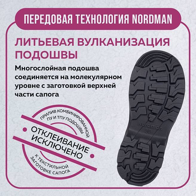 Детские сноубутсы Nordman Cross из ЭВА с уникальной антискользящей подошвой. О таких мечтает каждая мама – в них сухо, тепло. Они суперлегкие и не скользят. Сноубутсы Cross можно носить и в слякоть, и... Показать описание в мороз до -15°С В слякоть, потому что галошка сделана из водонепроницаемого ЭВА, а прочная ткань – с влагоотталкивающей пропиткой. Вставка на подошве из термопластика уменьшает риск скольжения в сноубутсах в 3-5 раз по сравнению с аналогичными сноубутсами. В мороз, потому что внутри шерстяной мех. Стелька – съемная – для удобства просушки. Под стелькой – тоже шерсть, поэтому стопа ребенка под двойной защитой от холода. Да и сам материал ЭВА отлично сохраняет тепло.