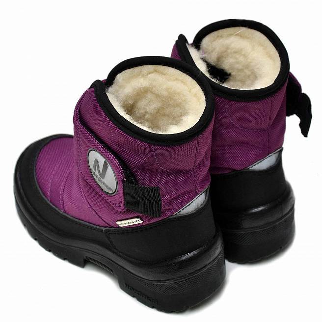 Для непостоянной переменчивой зимы. Они защитят ноги и от слякоти, и от мороза. Поэтому в такой обуви не страшны резкие перепады температуры зимой. При минусовой температуре они отлично сохраняют тепл... Показать описаниео благодаря утеплителю из натуральной шерсти (не менее 80%) Они защищают от воды (водонепроницаемость: 10 000 mm) и холода (внутри натуральная шерсть). Мембрана «дышит» (5 000 г/кв.м/24 ч), поэтому ноги ребенка остаются сухими (не потеют) и теплыми. А при околонулевой температуре в них тепло и сухо, потому что мембрана защищает от воды и дышит. Ноги не перегреваются и не потеют – поддерживается комфортный микроклимат. Стелька двухслойная – из меха и нетканого полотна. С помощью специальной петельки легко вынимается. Подошва – литая, из полиуретана. Не дубеет на морозе и не скользит. На пятке светоотражающий элемент.