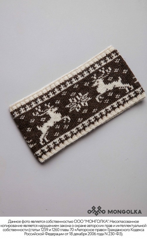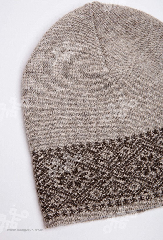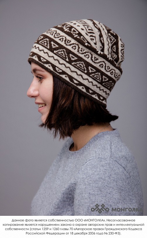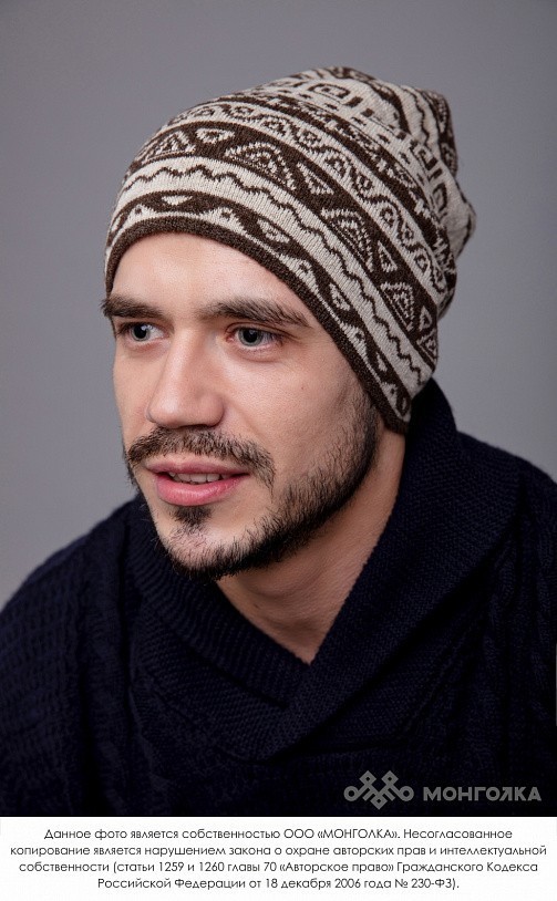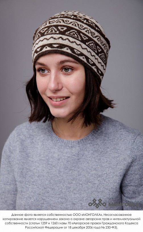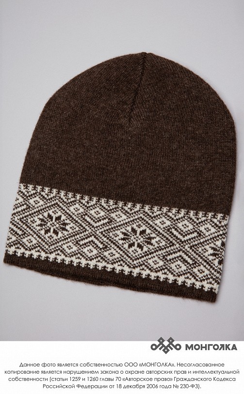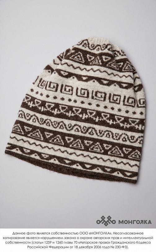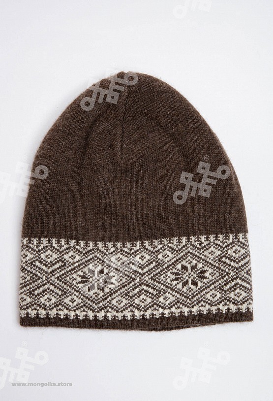 Шапка из монгольской овечьей шерсти сохраняет тепло в любые морозы, но для выполнения этой функции следует обращать внимание на состав изделия. Теплая шапка, в составе которой 100% шерсть монгольской ... Показать описаниеовцы, отводит лишнюю влагу и подарит чувство сухости и комфорта в холодную погоду. Шерстяная шапка дополнит любой образ и может стать согревающим подарком для близкого человека. В нашем ассортименте вы найдете еще больше товаров из натуральной шерсти, доставленных напрямую из Монголии. Производитель: Монголия, TOD Состав: 100% шерсть монгольской овцы Цвет: шоколадный с орнаментом Размер: ОГ 56-58 см. Ширина: 26 см. Двойная вязка Можно носить с подворотом